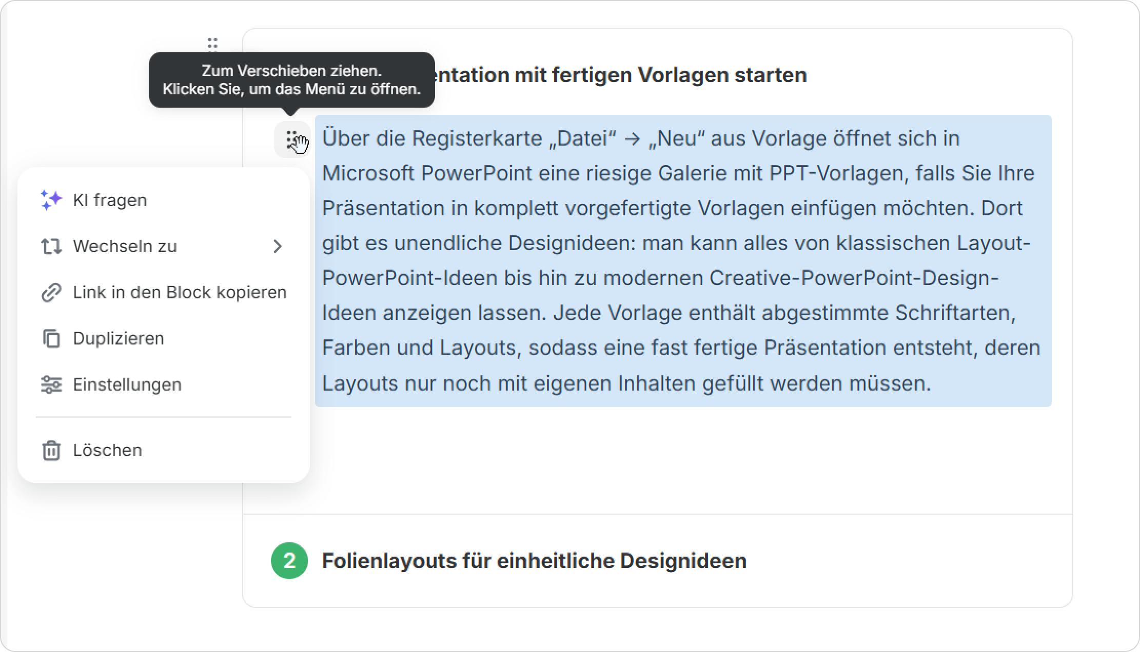 Das Akkordeon bietet auch Optionen zum Gruppieren, Duplizieren oder Löschen von Inhalten. Befolgen Sie dazu diese Schritte: