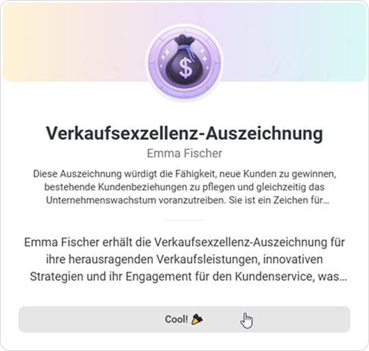 Im Abschnitt "Auszeichnungen" und auf den Benutzerkarten können Sie sich über Unternehmensauszeichnungen und die Empfänger informieren.