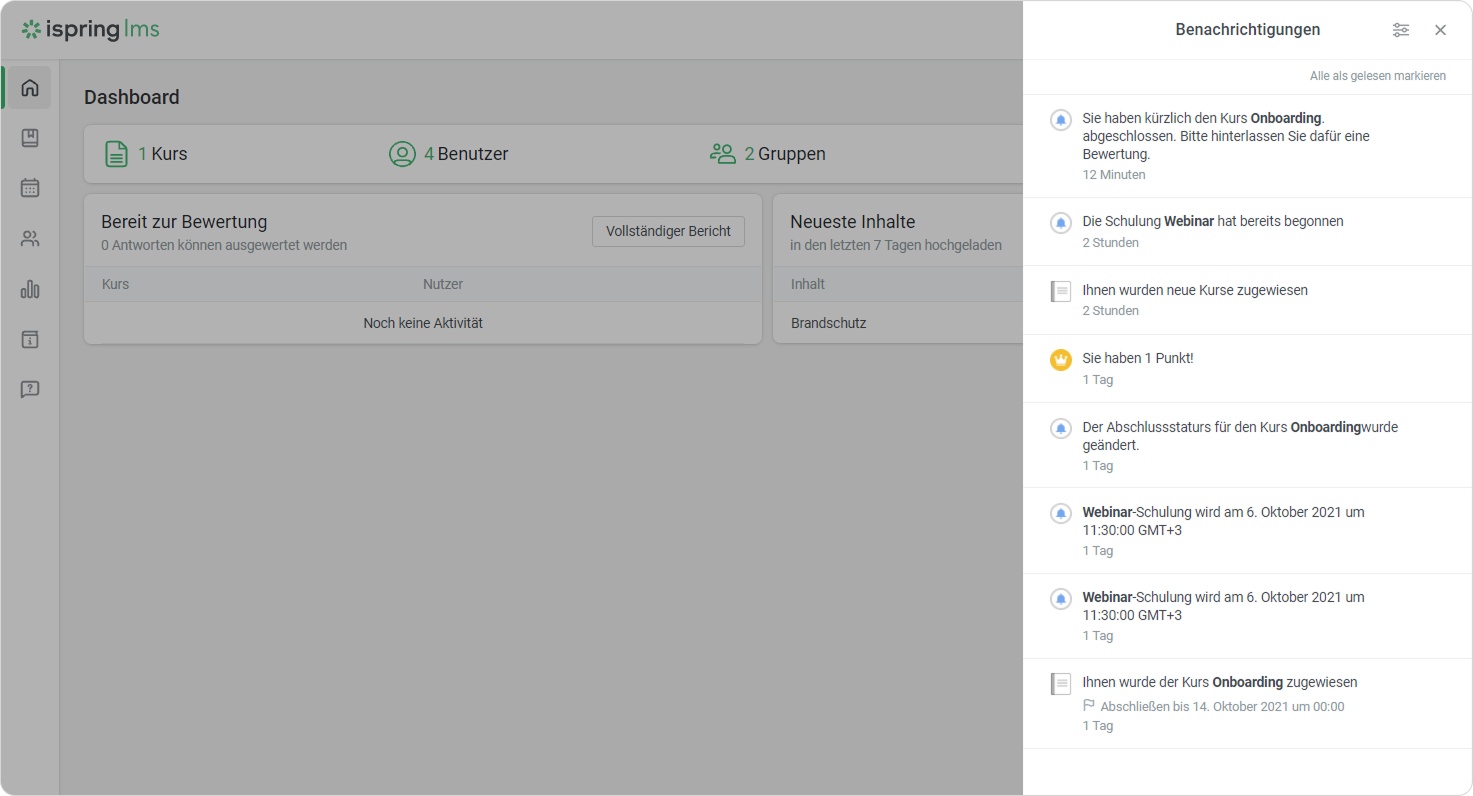 Automatisierte Benachrichtigungen in iSpring LMS sind eine effektive Möglichkeit, Benutzer über neue Ereignisse auf dem Laufenden zu halten.