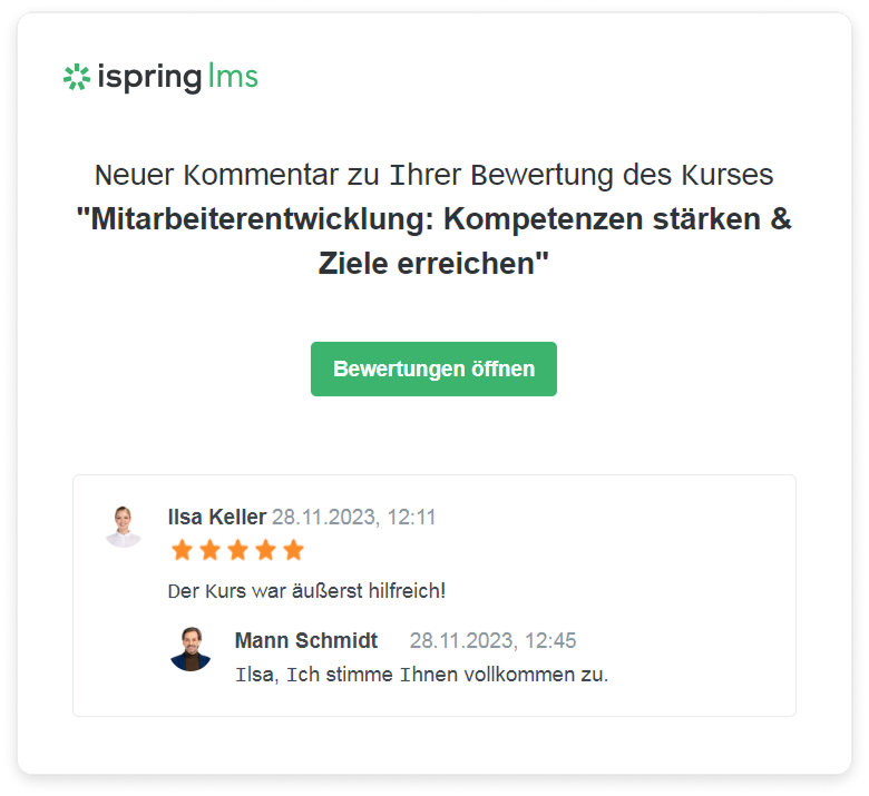 iSpring LMS benachrichtigt den Lernenden, dass auf seine Bewertung oder seinen Kommentar geantwortet wurde: Er erhält eine E-Mail, eine Benachrichtigung im Portal und eine Push-Benachrichtigung.