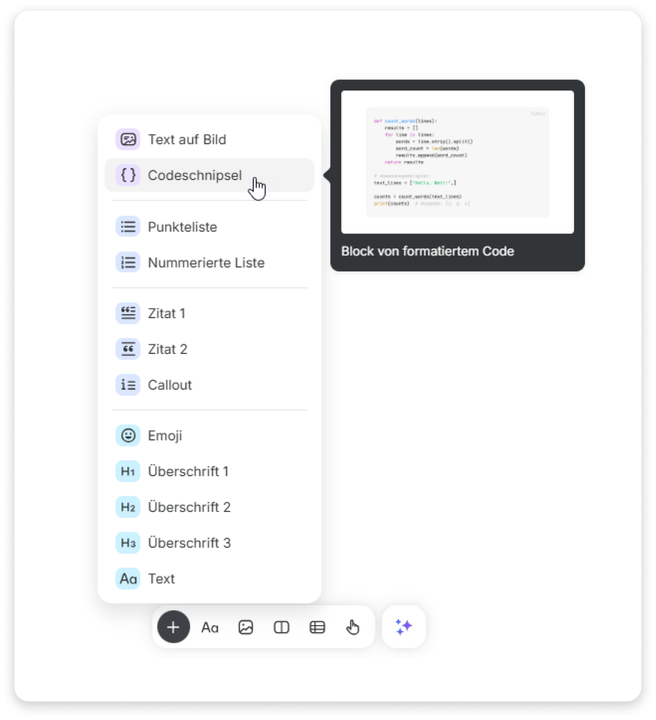 - In der Werkzeugleiste navigieren Sie zu Text und wählen Codeschnipsel aus.