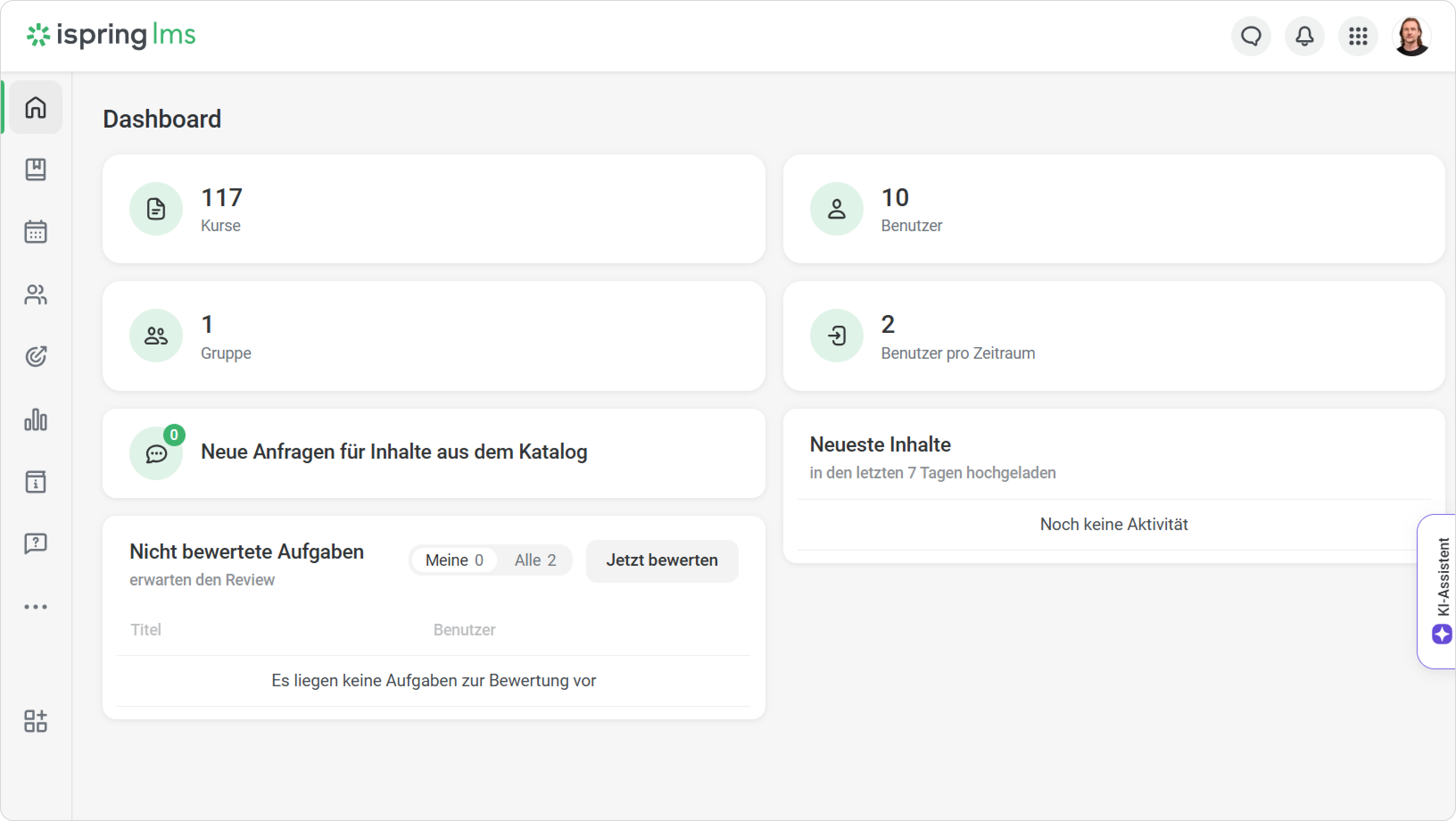 Das Dashboard ist die erste Seite, die Sie sehen, nachdem Sie sich bei Ihrem iSpring LMS-Konto angemeldet haben.
