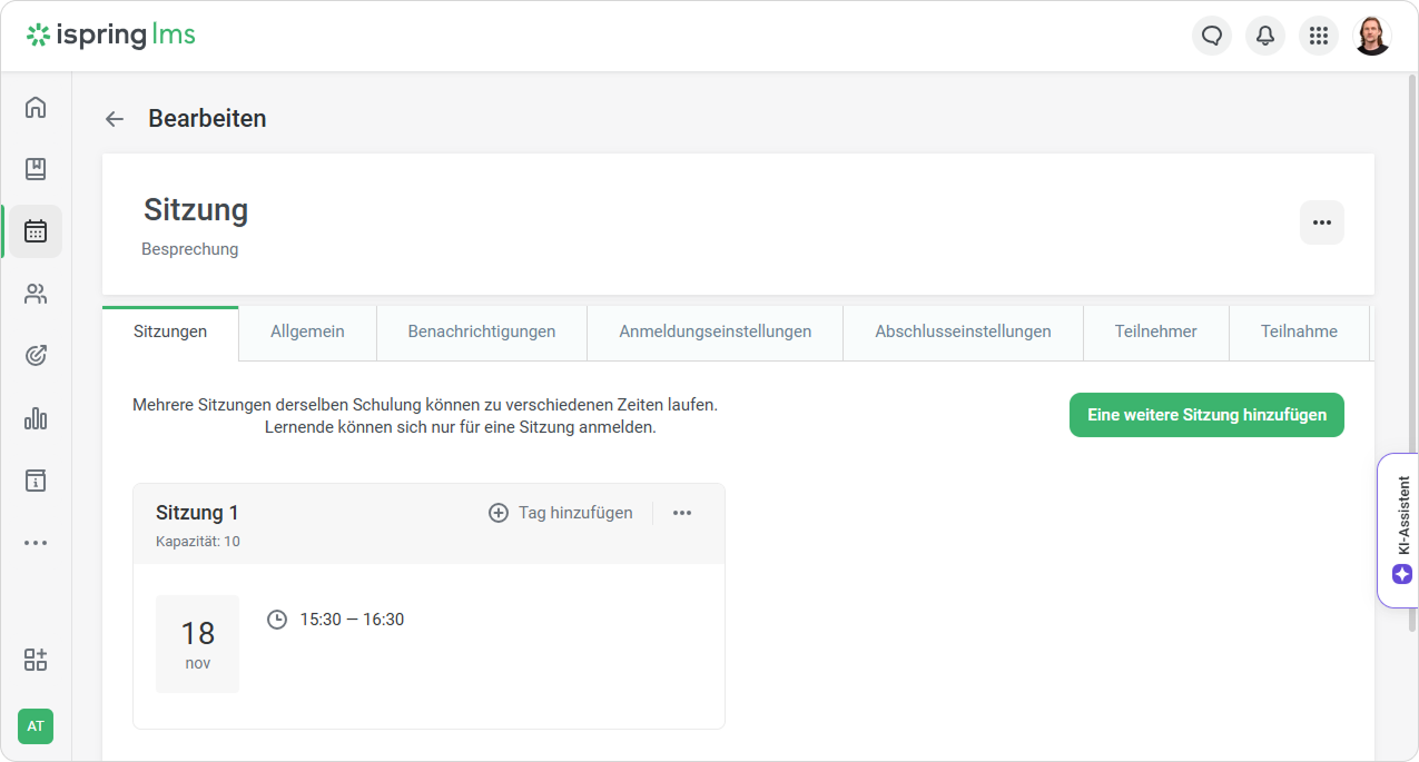 Ihre Schulung wurde erstellt. Jetzt gibt es nur eine Schulungssitzung auf der Registerkarte Sitzungen.