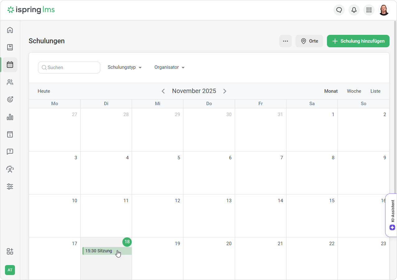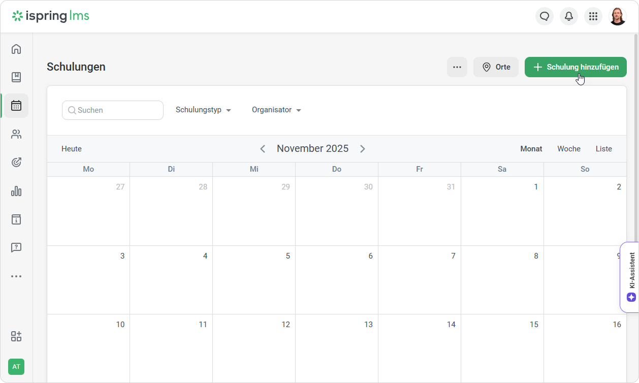 Der Kontoinhaber, Kontoadministratoren, Abteilungsadministratoren, Herausgeber und Benutzer mit einer benutzerdefinierten Rolle, die zum Erstellen von Schulungen aktiviert ist, können alle neue Schulungen hinzufügen.