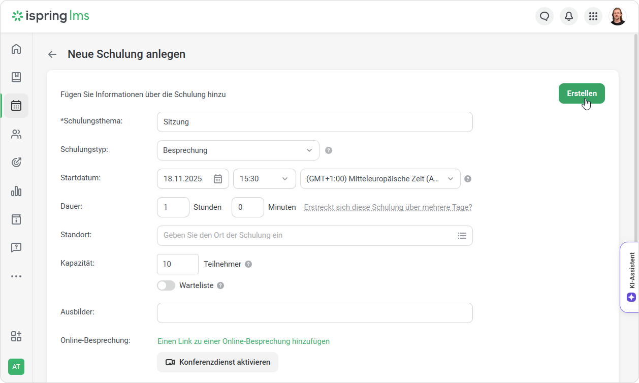 Füllen Sie alle Felder mit den Details der Schulung aus und klicken Sie auf Erstellen.