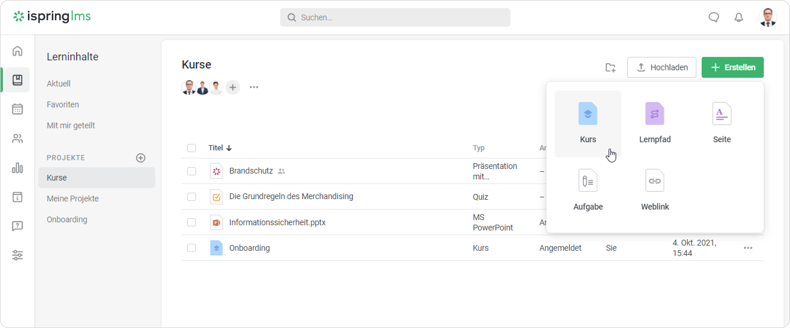 - Wählen Sie das Projekt aus, öffnen Sie das Menü Erstellen und wählen Sie Kurs.