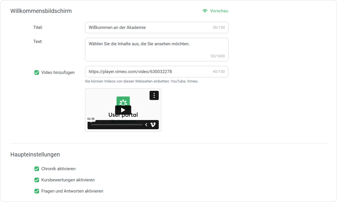 Wenn Sie überprüfen möchten, wie das Benutzerportal nach den Änderungen aussieht, klicken Sie oben auf der Seite auf Vorschau. Die neue Seite wird geöffnet, auf der Sie sehen können, wie das Konto für Ihre Lernenden aussieht.