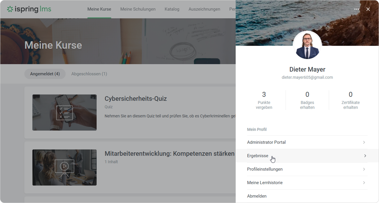 Im Abschnitt Ergebnisse können Benutzer alle Badges und Zertifikate einsehen, die sie erhalten haben, ihren Rang auf der Bestenliste überprüfen und die Anzahl der Punkte, die sie verdient haben, abfragen.