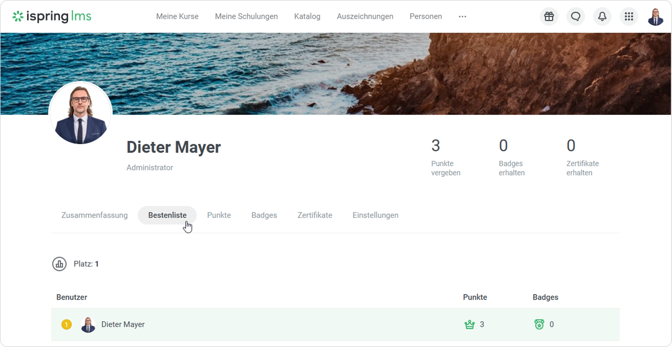 Benutzer erhalten Badges für Kurse, die sie abschließen, und Punkte, die sie verdienen. Sie können Bedingungen für die Vergabe von Badges in den Einstellungen zur Gamifizierung festlegen.