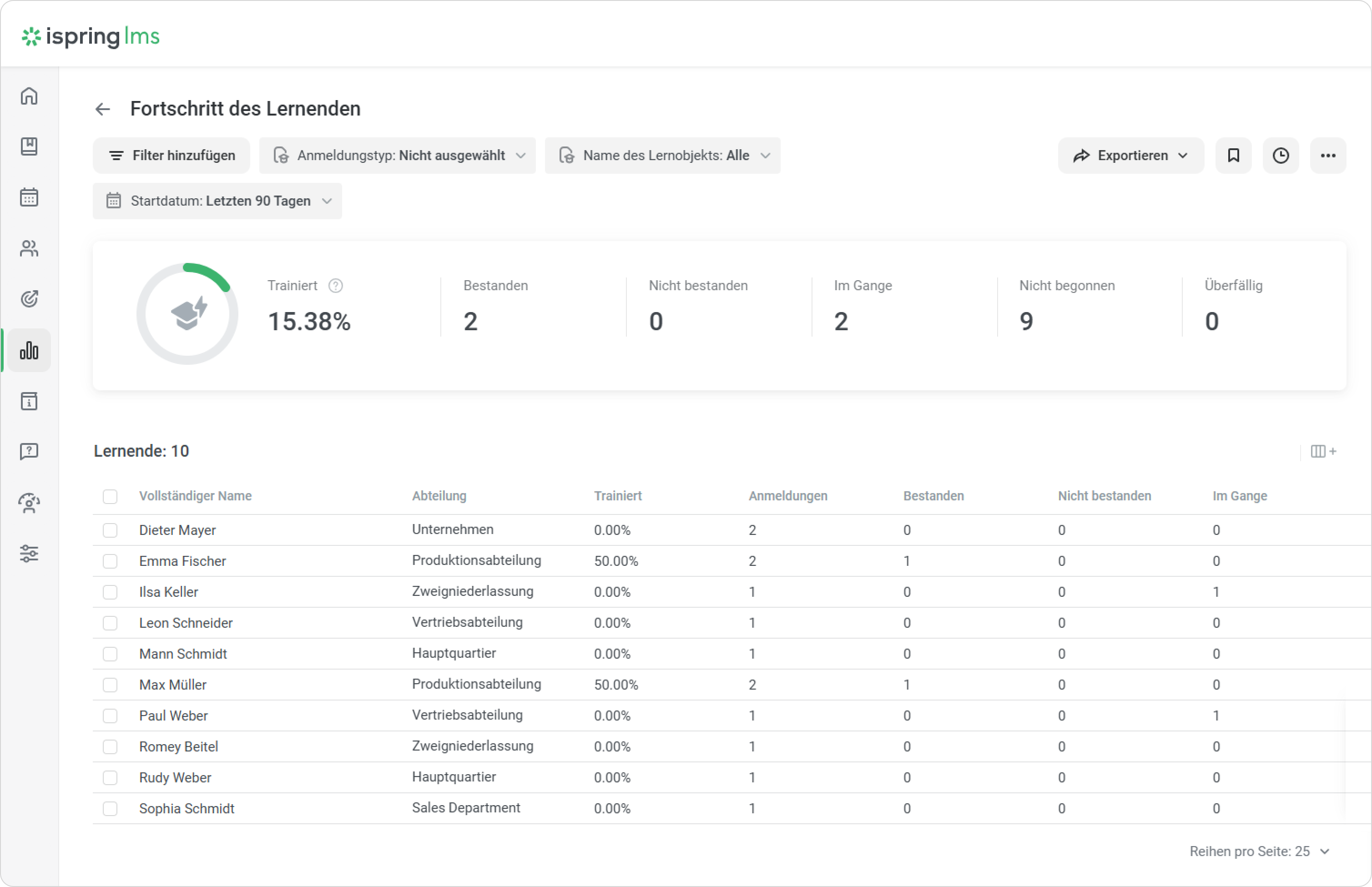 Ein neuer Lernfortschrittsbericht ist eine einfache und bequeme Möglichkeit, herauszufinden, wie Ihre Mitarbeiter Kurse studieren. Mit dem Bericht können Sie leicht überprüfen, ob Benutzer einer bestimmten Abteilung überfällige Kurse haben oder wie weit die Lernenden im Inhaltselement fortgeschritten sind.