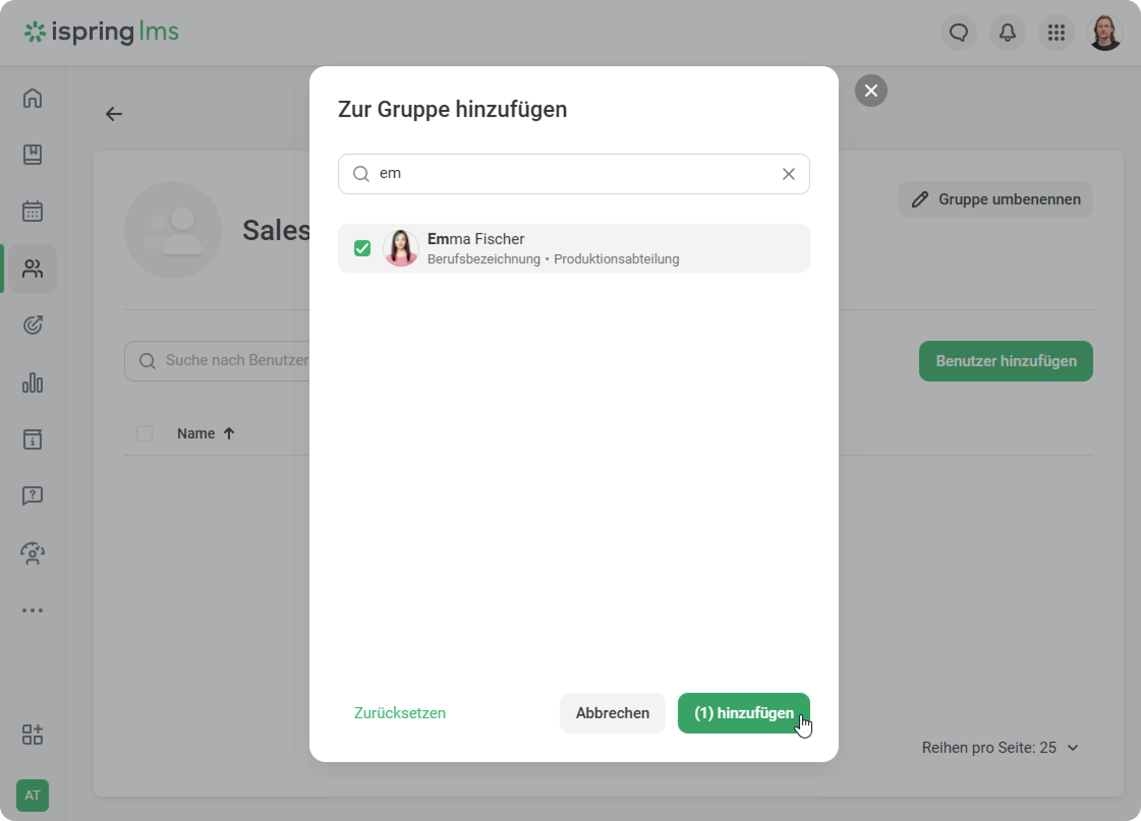 Fügen Sie im Fenster Benutzer hinzufügen die Lernenden hinzu, die der Gruppe angehören sollen. Beginnen Sie mit der Eingabe des Namens, Nachnamens, Logins oder der E-Mail-Adresse eines Benutzers und wählen Sie passende Namen aus den Systemvorschlägen aus.