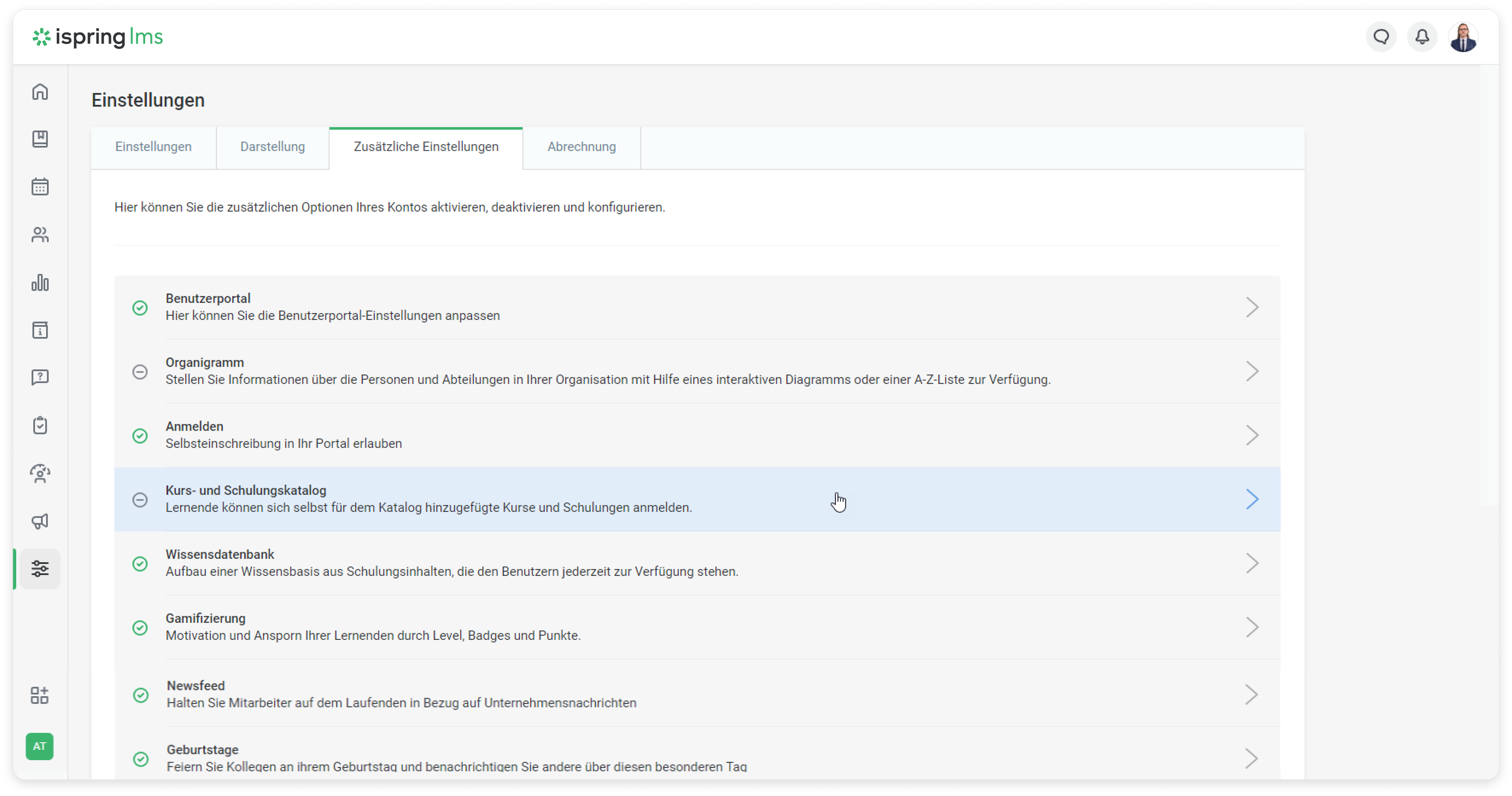 Aktivieren oder deaktivieren Sie den Kurskatalog im Konto. Dies ist standardmäßig deaktiviert.