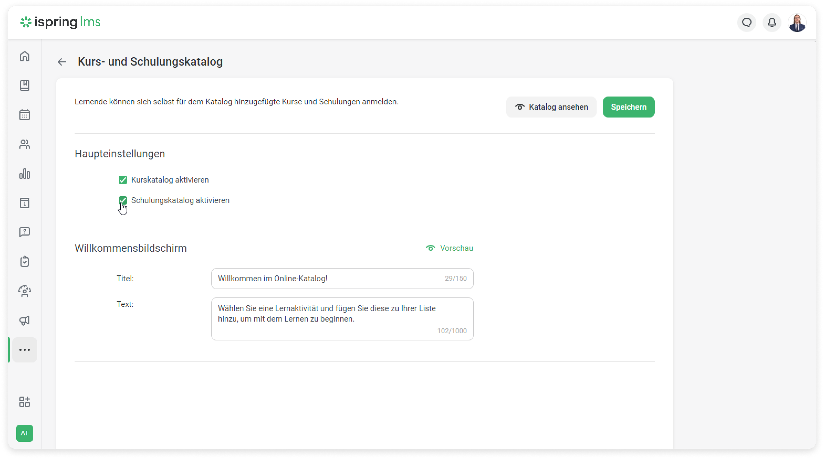 Aktivieren und deaktivieren Sie auf der geöffneten Seite den Kurs- und Schulungskatalog, ändern Sie den Begrüßungstext und die Anweisungen und verwalten Sie die Kategorien.