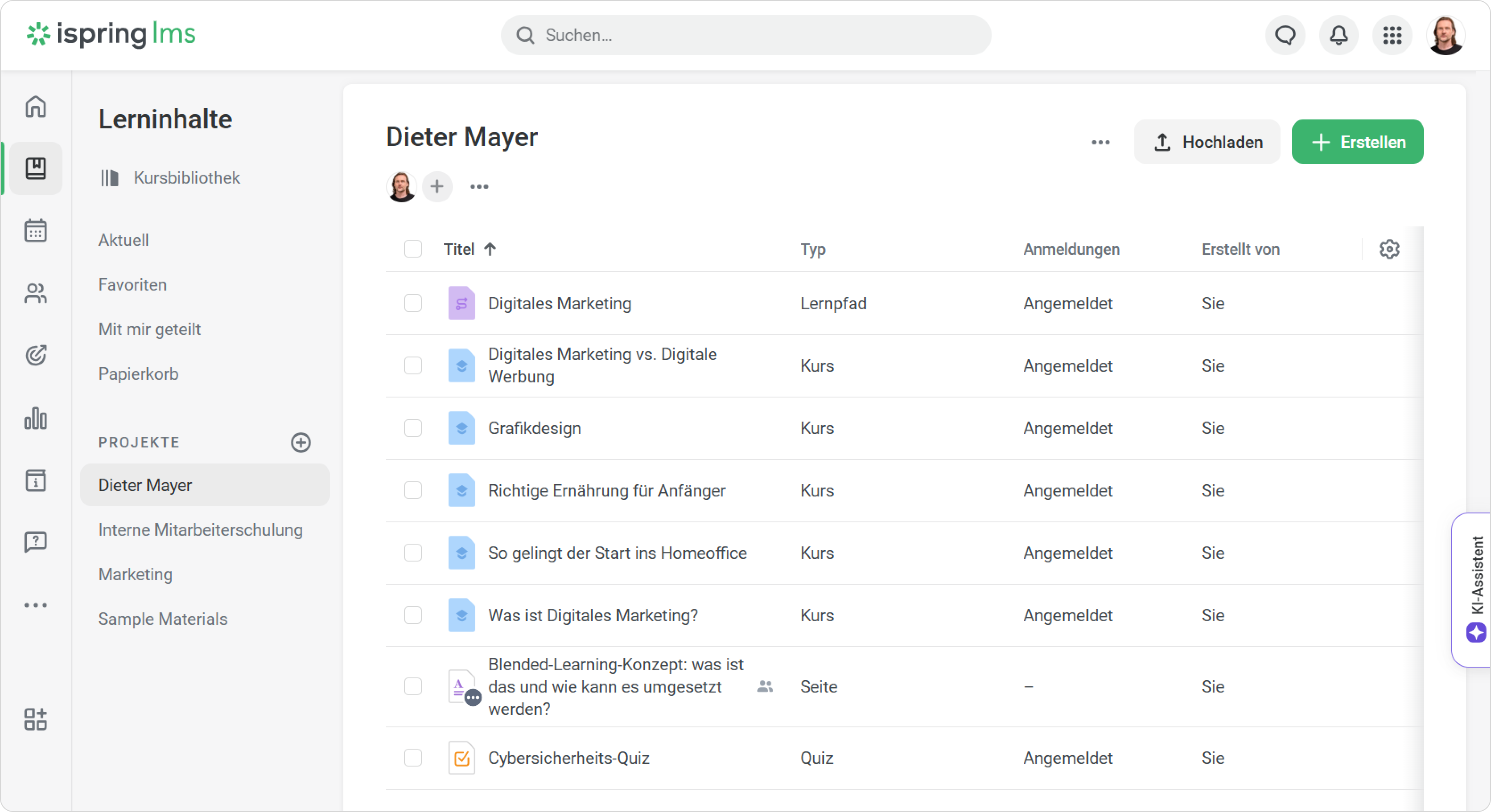 Alle Kurse, Quiz und Lernpfade werden in Projekten im Bereich Lerninhalte gespeichert. Ein Projekt ist eine Ansammlung von Materialien, die ein gemeinsames Thema behandeln oder für eine bestimmte Gruppe von Lernenden entwickelt wurden.