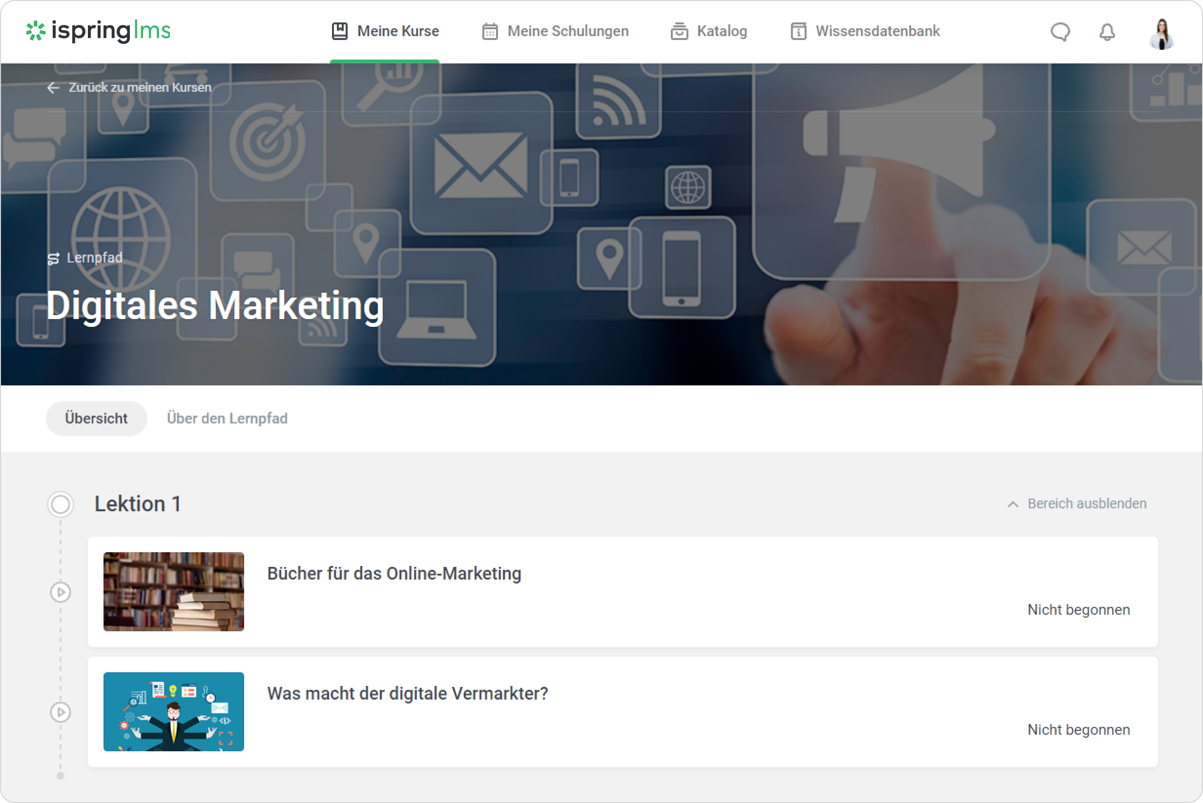 Normalerweise enthält ein Kurs in einem LMS bereits mehrere Inhaltselemente (Module), beispielsweise einen PDF-Leitfaden, eine SCORM-Datei und einen Test. Der Lernpfad ermöglicht es Ihnen, mehrere Kurse zu einem langfristigen Curriculum zusammenzufassen.