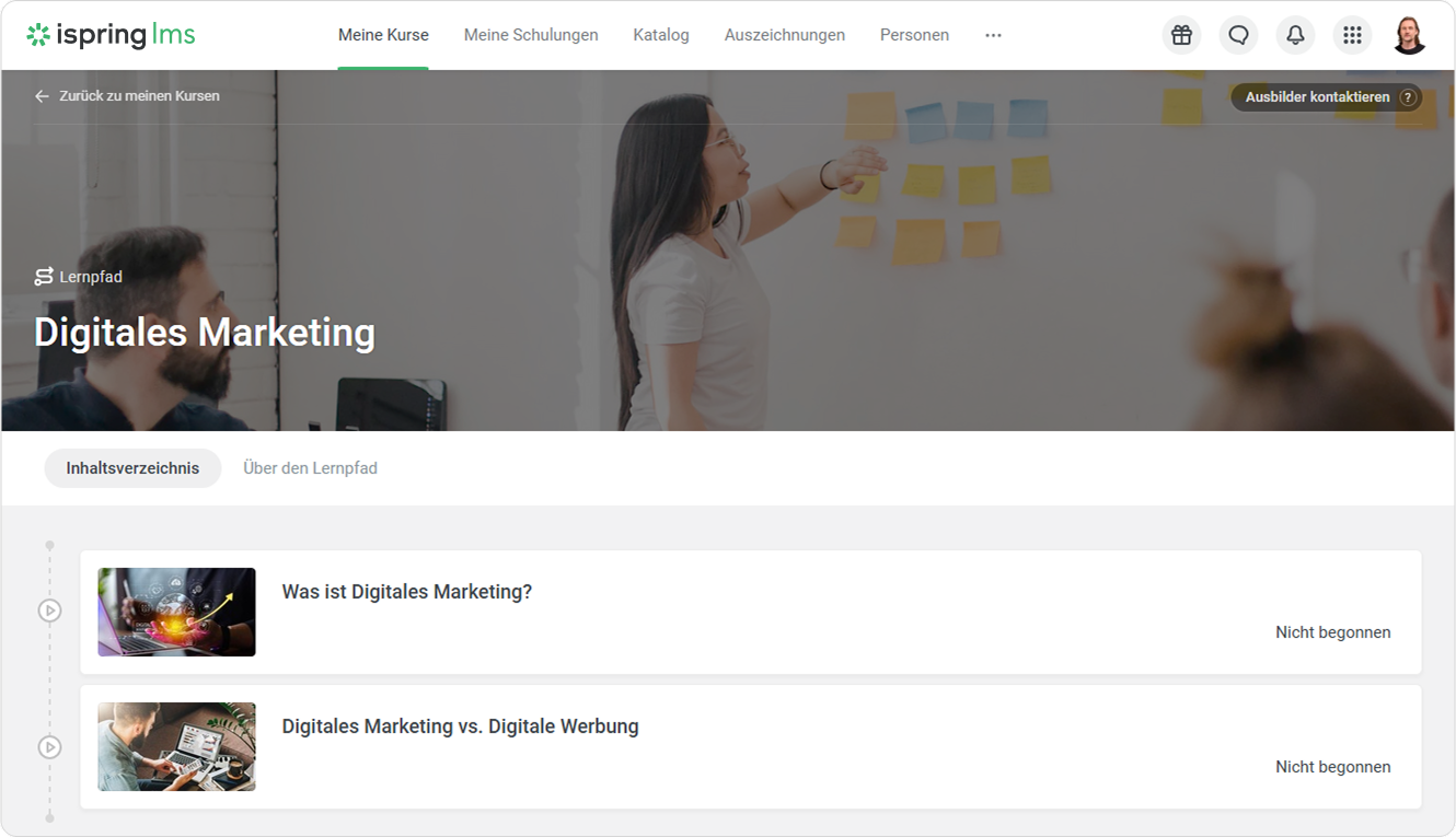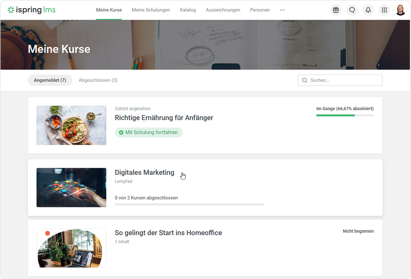 Wenn Sie einem Benutzer einen Lernpfad zuweisen, wird dieser im Abschnitt Meine Kurse des Benutzerportals angezeigt. Um mit dem Lernen fortzufahren: