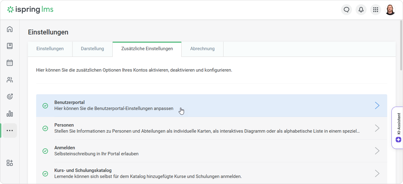 - Öffnen Sie den Abschnitt Einstellungen, klicken Sie auf die Registerkarte Zusätzliche Einstellungen und wählen Sie Benutzerportal.