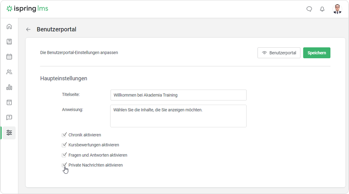 - Wählen Sie auf der Seite Benutzerportal die Option Private Nachrichten aktivieren. Klicken Sie abschließend auf Speichern.