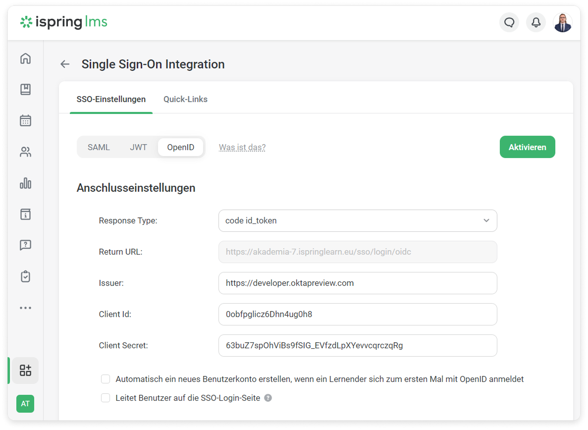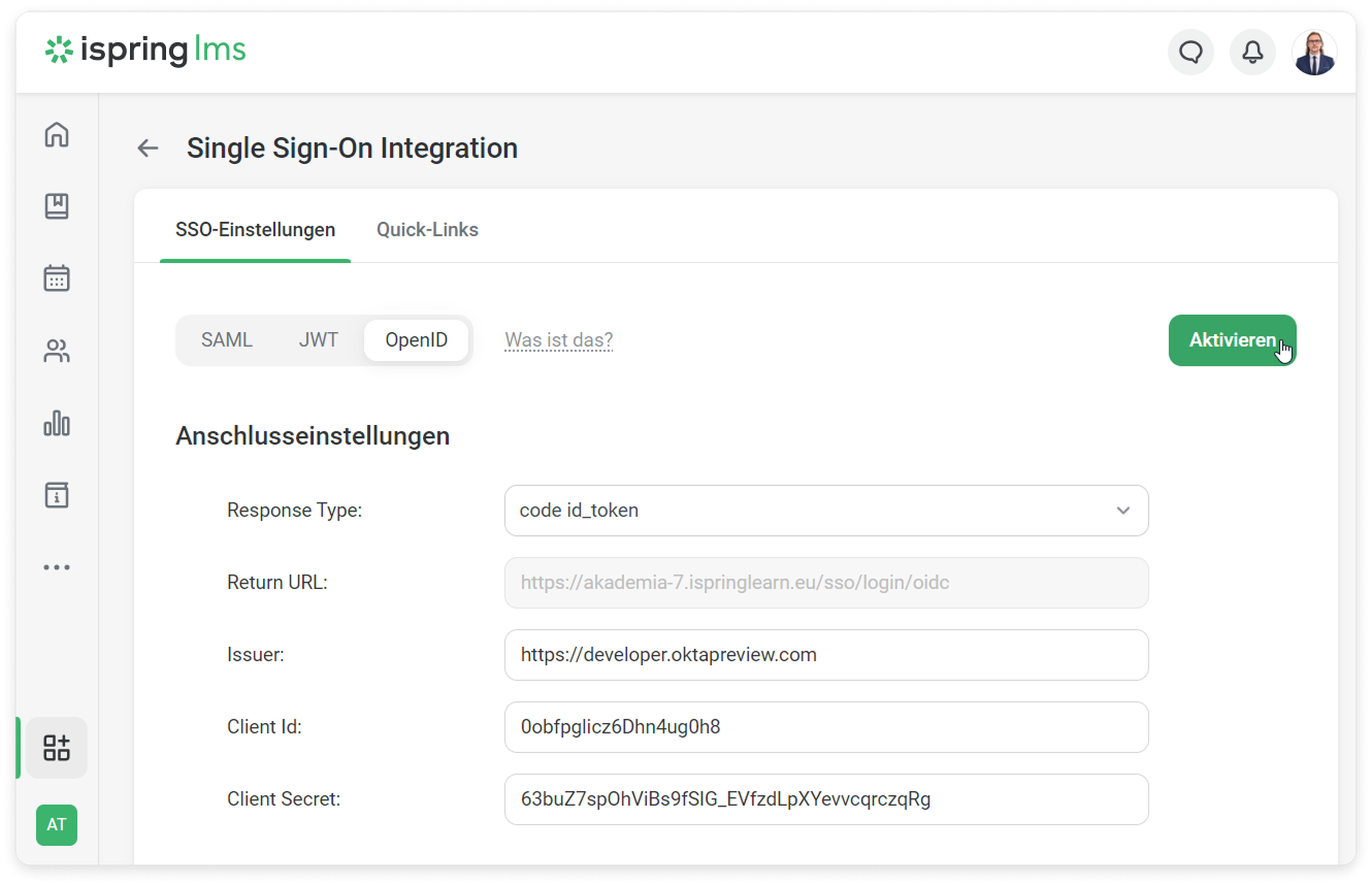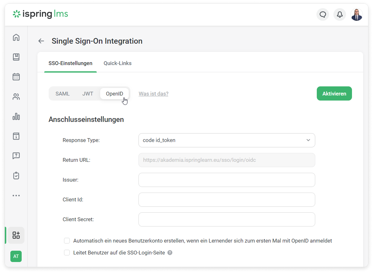 - Melden Sie sich bei Ihrem iSpring LMS-Konto an. Gehen Sie dann zu den SSO-Einstellungen und klicken Sie auf OpenID.