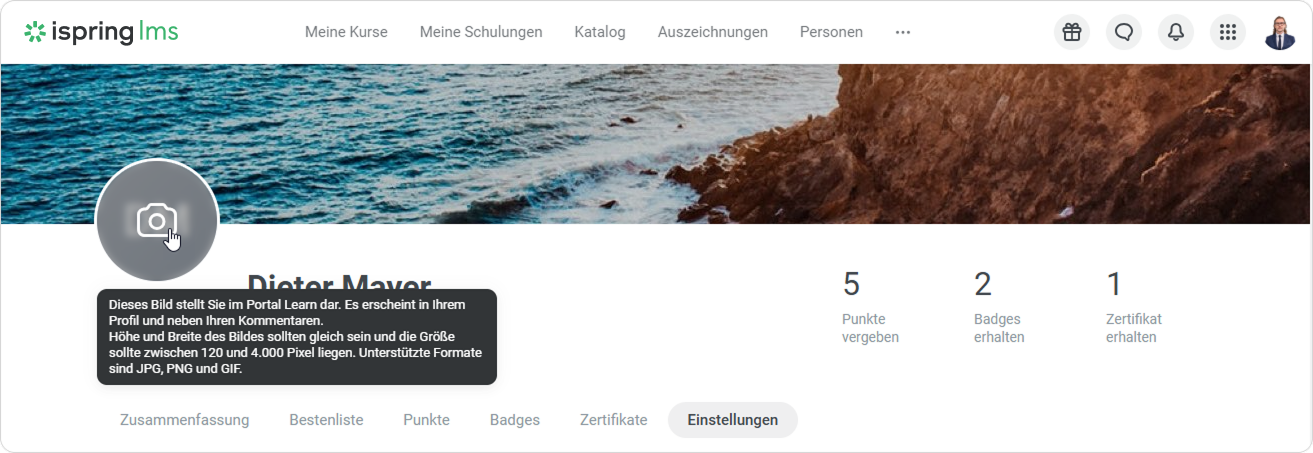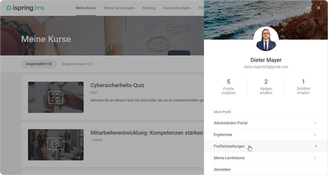 Im Abschnitt Einstellungen können Lernende ihr Foto, die Sprache ihres Portals und ihr Passwort ändern.