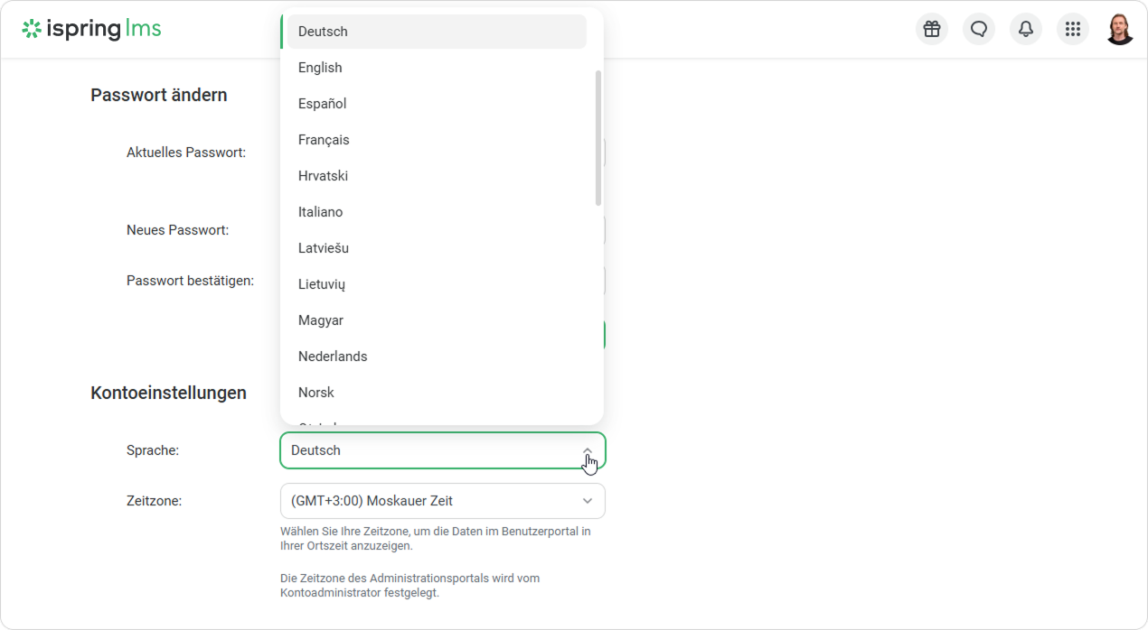Derzeit umfasst iSpring LMS 27 Sprachen: Englisch, Russisch, Spanisch, vereinfacht Chinesisch, traditionell Chinesisch, Japanisch, Portugiesisch, Deutsch, Mongolisch, Französisch, Italienisch, Niederländisch, Finnisch, Ukrainisch, Norwegisch, Polnisch, Aserbaidschanisch, Kasachisch, Rumänisch, Koreanisch, Bulgarisch, Tschechisch, Usbekisch, Dänisch, Griechisch, Arabisch, Indonesisch und Katalanisch.