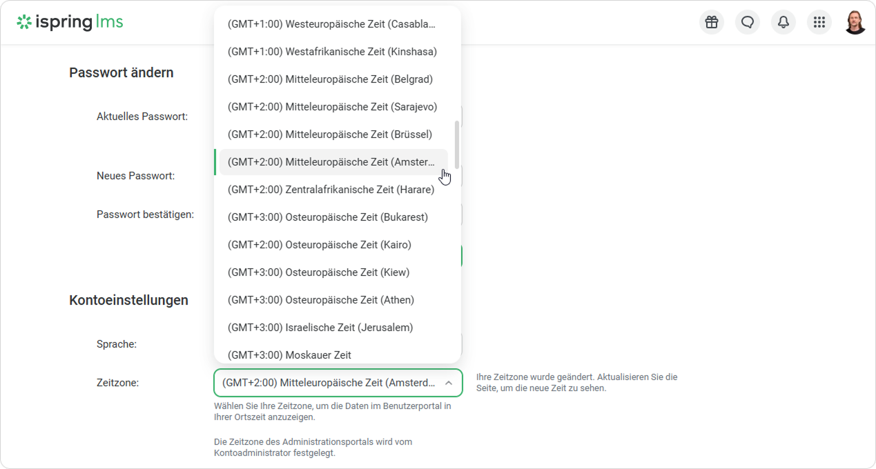 Wählen Sie Ihre Zeitzone aus, um Daten im Benutzerportal in Ihrer lokalen Zeit anzusehen. Die Fristen für das Bestehen von Kursen, die Zeit im Training und die Daten im Dashboard werden umgerechnet.