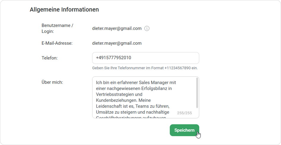 Benutzer können ihre Telefonnummer und persönliche Informationen hinzufügen, wenn ihr Organigramm aktiviert ist. Sie haben ein Limit von 255 Zeichen für das Feld Über mich. Vergessen Sie nicht, die von Ihnen vorgenommenen Änderungen zu speichern.