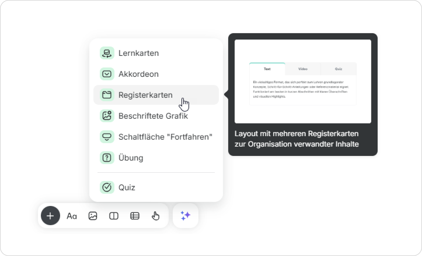 Verwenden Sie Registerkarten, um Inhalte in einer Seite ordentlich zu organisieren. Dies hilft Lernenden, schnell zu finden, was sie benötigen, ohne durch lange Textblöcke scrollen zu müssen.