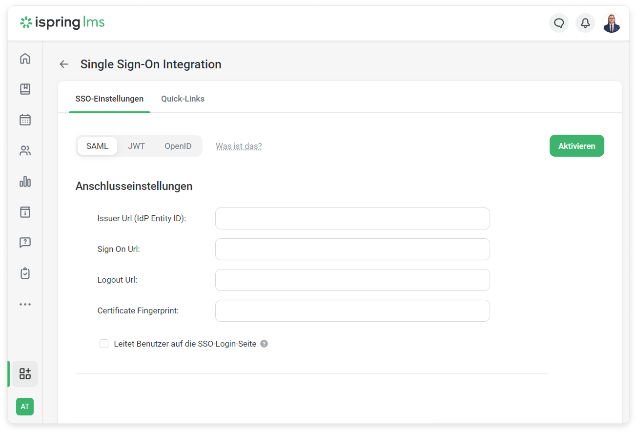 Damit der nahtlose in iSpring LMS funktioniert, muss der Administrator die SSO-Integration auf seiner Seite konfigurieren. Die Integration sollte nach dem Standard eines bestimmten IdP-Anbieter konfiguriert werden. Mehrere Standards funktionieren in iSpring LMS nicht gleichzeitig.