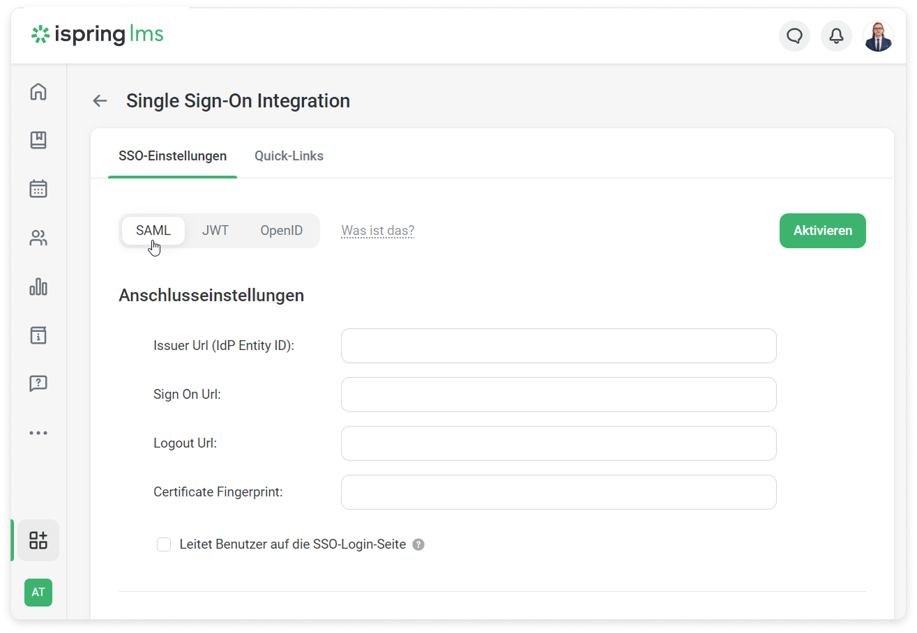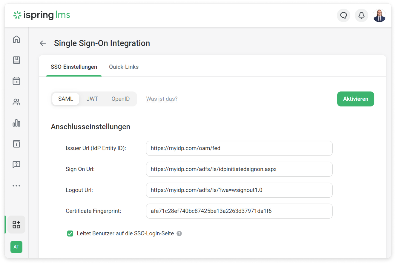 Wenn diese Option aktiviert ist, hat die iSpring-Anmeldeseite die folgende URL: https://yourcompany.ispringlearn.com/sso/login.