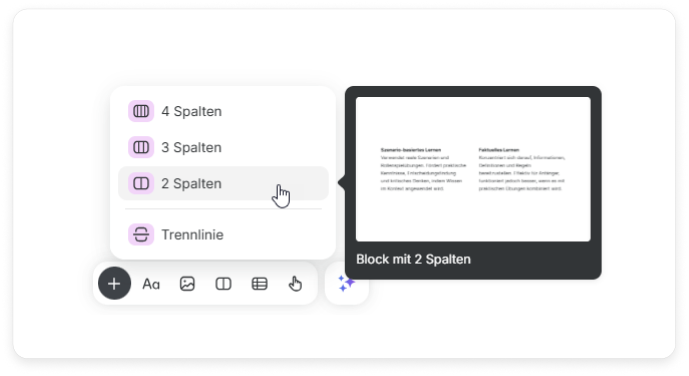 Spalten sind ein Layout, das die Anordnung verschiedener Objekte ermöglicht, wie zum Beispiel: Text, Überschriften, Listen, Callout, Zitate, Trenner, Bilder, Videos, Einbettungen, Linkvorschauen. Sie können in 2–4 Spalten angeordnet werden.