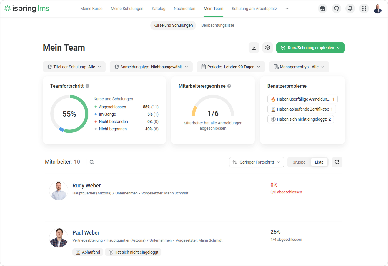 Dieser Abschnitt zeigt die Gesamtzahl der Mitarbeiter Ihres Teams. Der Abschnitt hilft Ihnen herauszufinden, wann sich die Mitarbeiter zuletzt im System angemeldet haben, und wie viele Kurse abgeschlossen, überfällig oder nicht bestanden sind.