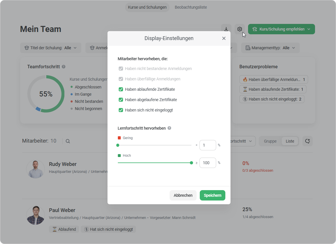 Der Abschnitt Teamfortschritt zeigt den kollektiven Fortschritt des Teams bei Kursen und Schulungen.