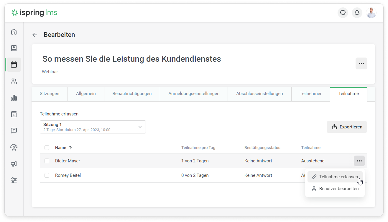 - Gehen Sie auf die Registerkarte Teilnahme und klicken Sie neben dem Namen des Mitarbeiters auf Teilnahme erfassen.