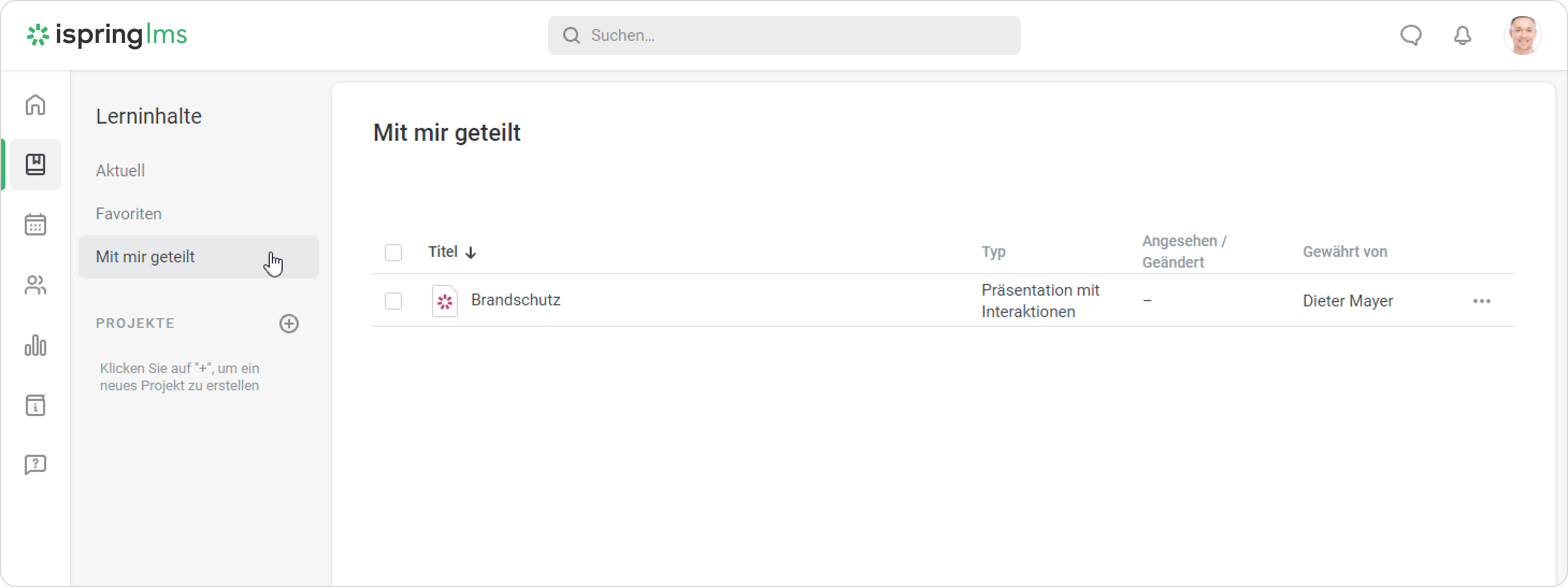 Das Material wird im Abschnitt Mit mir geteilt in den Konten der Teammitglieder angezeigt, denen Zugriff auf das Material gewährt wurde.