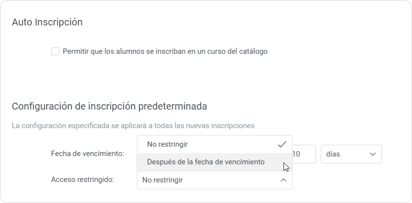Puede mantener el curso disponible para su visualización después de la fecha de vencimiento o cerrar el acceso.