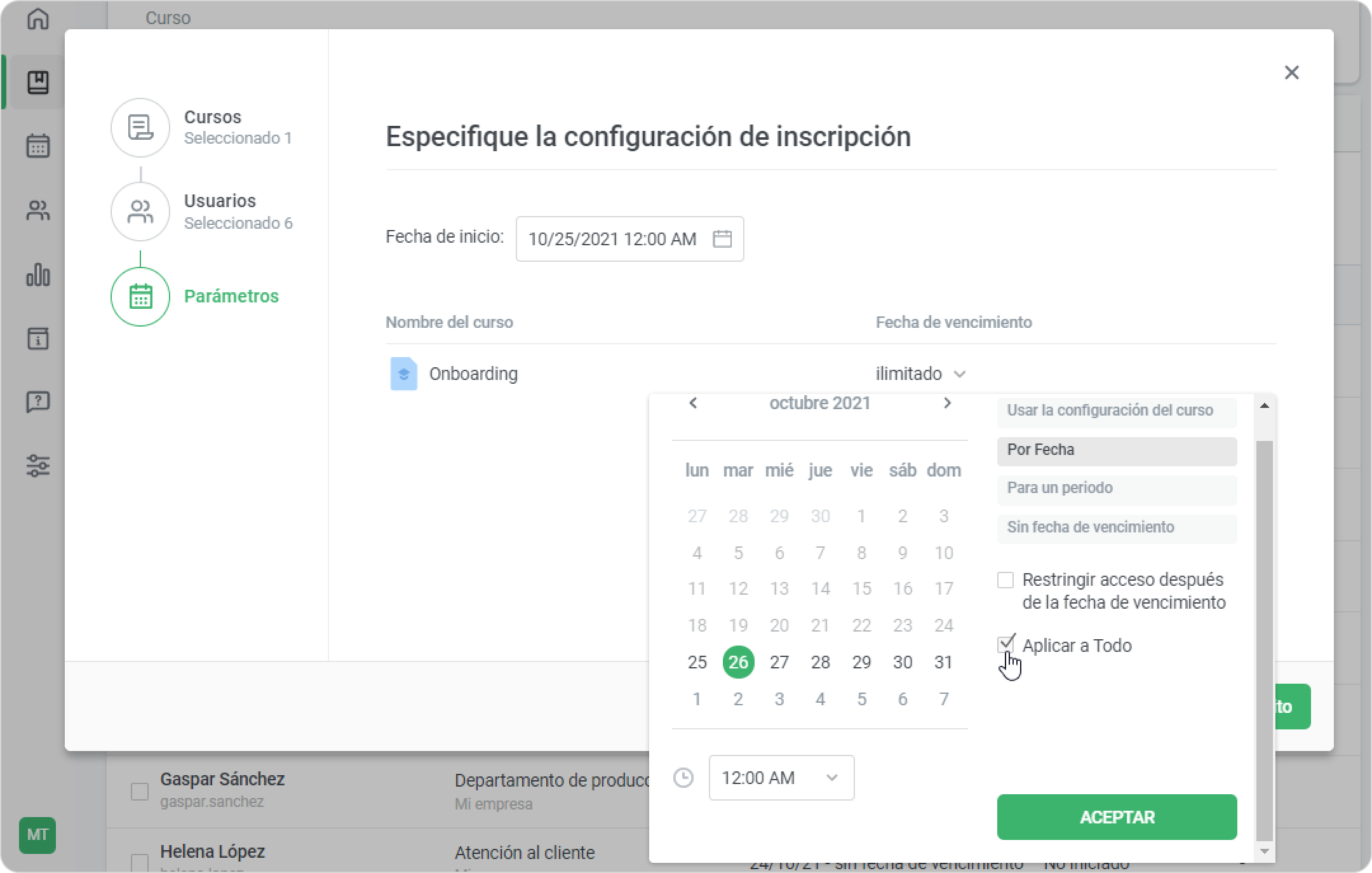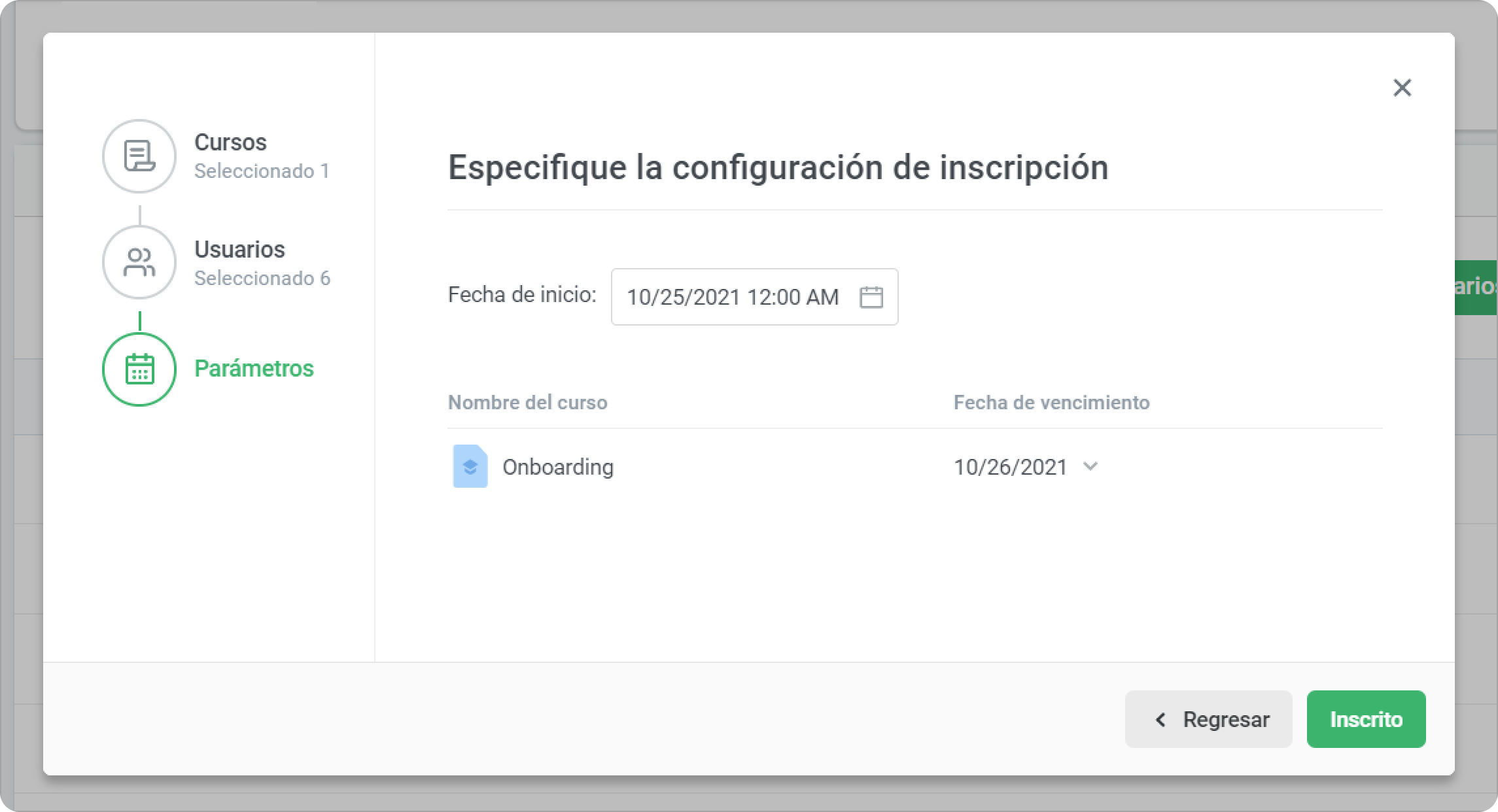 El curso a asignar se elegirá en la ventana abierta. Seleccione los usuarios que se inscribirán en él y vaya al paso Parámetros.