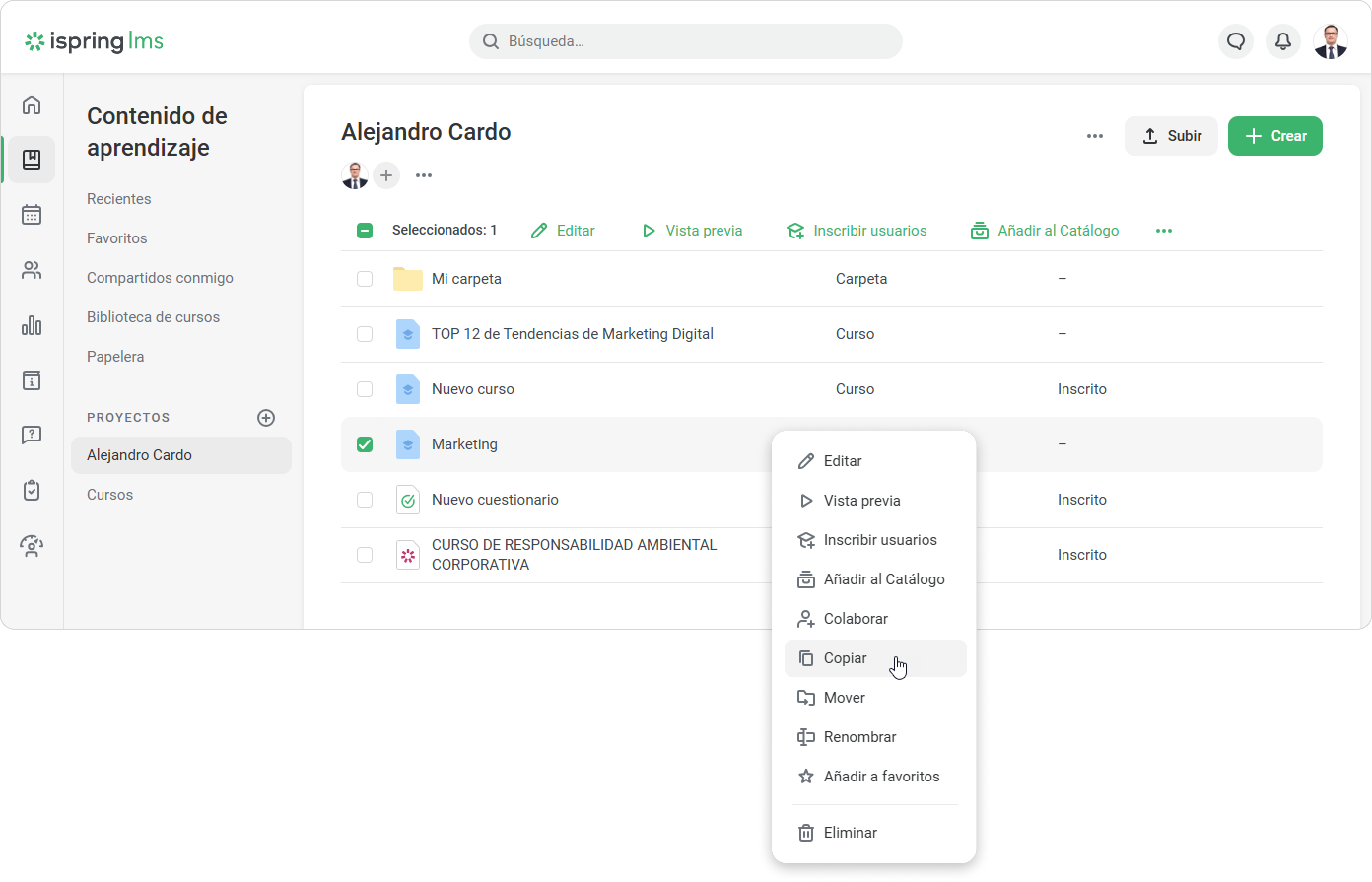 - Abra la sección Contenido de aprendizaje y seleccione un curso. A continuación, haga clic en el enlace Copiar en el menú superior.