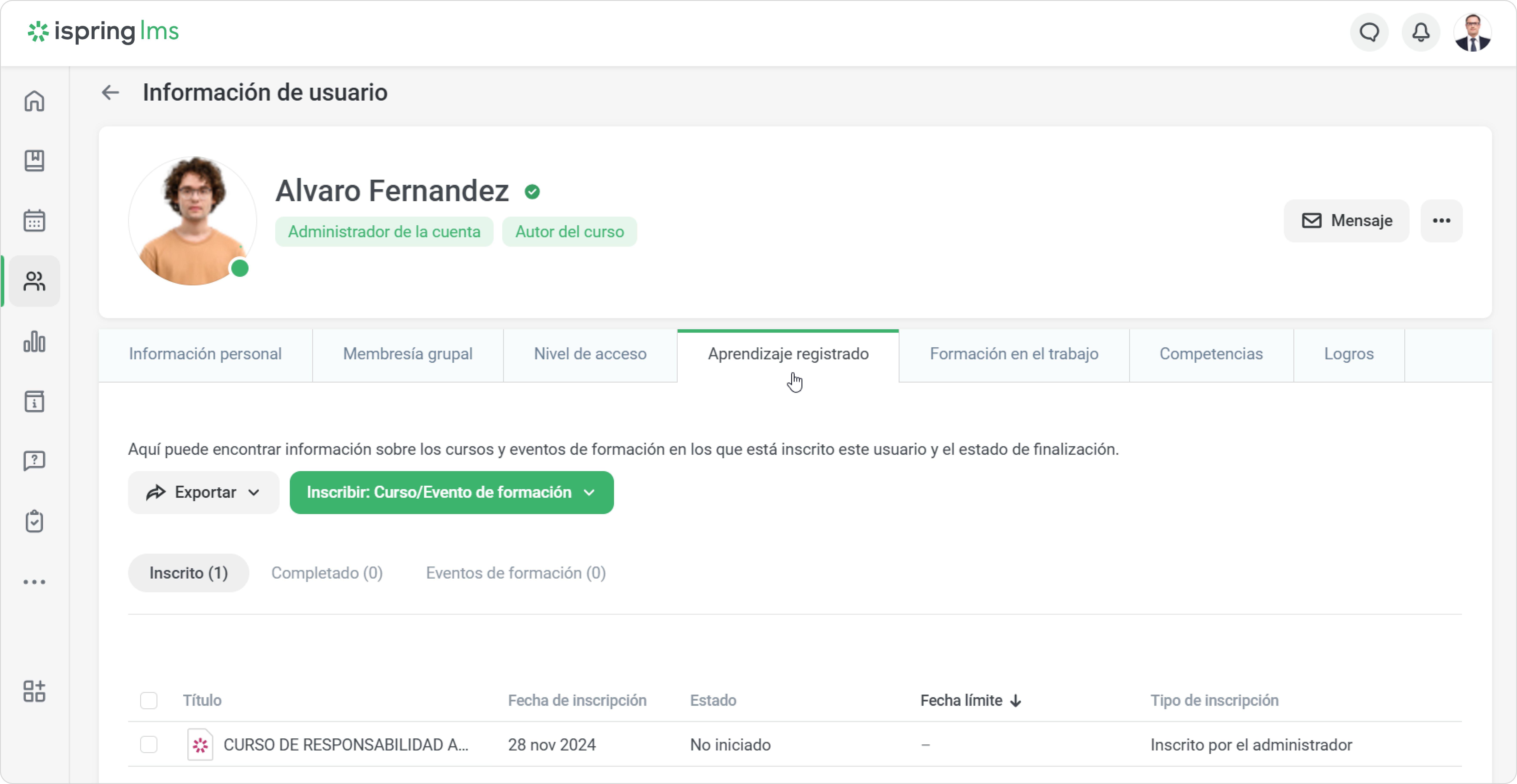 En la página Información de usuario, abra la pestaña Aprendizaje registrado.