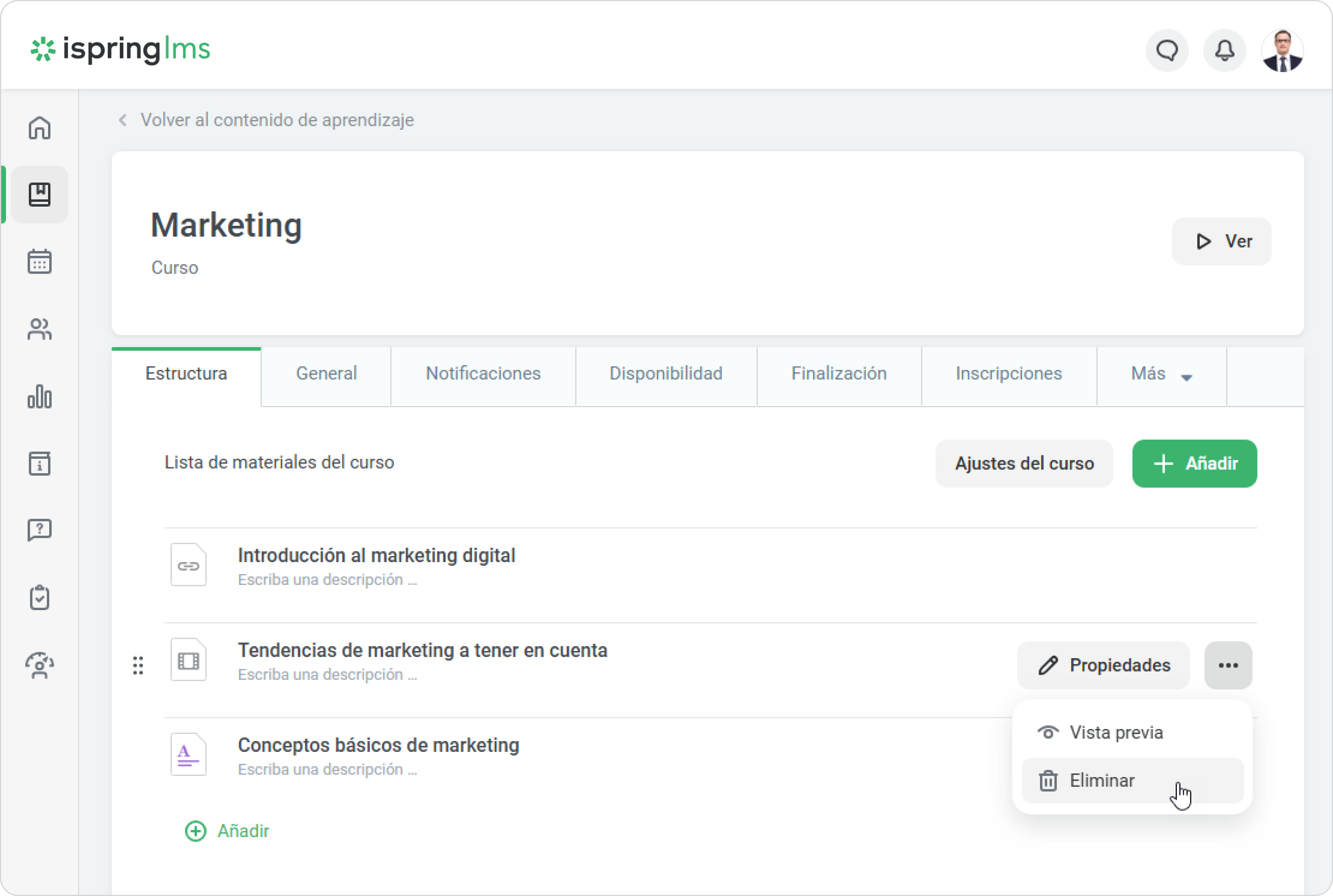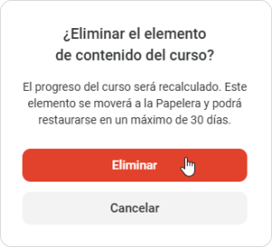 Después confirme su decisión en la ventana de Eliminar el elemento de contenido del curso.