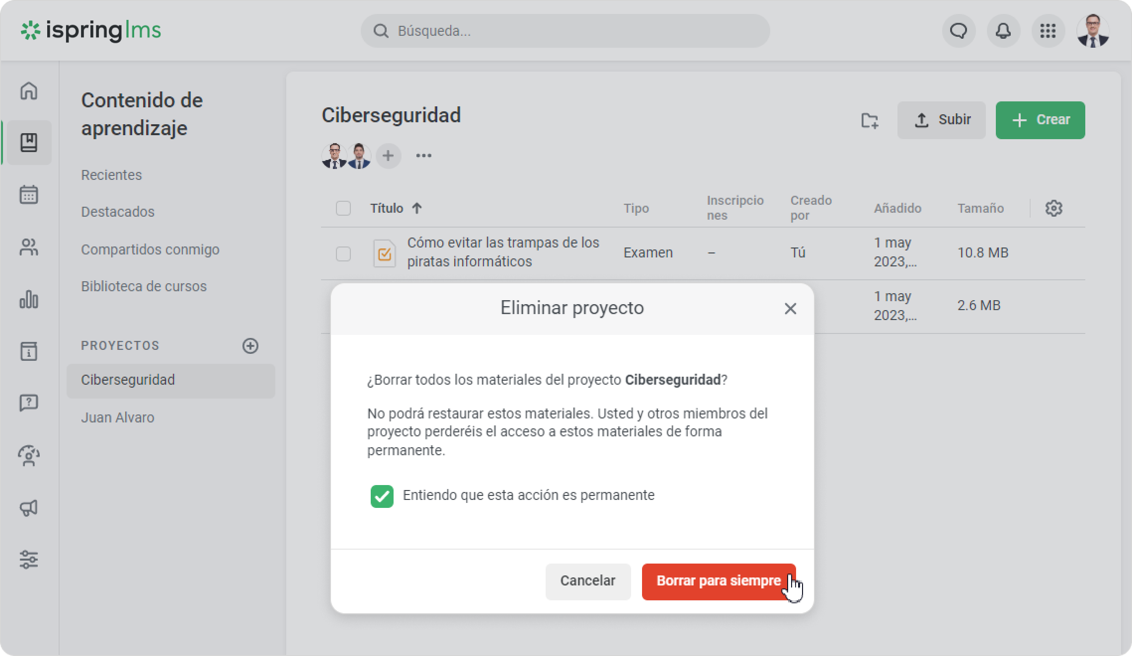 - Confirma que deseas eliminarlo. Este proyecto y todos sus materiales serán eliminados.