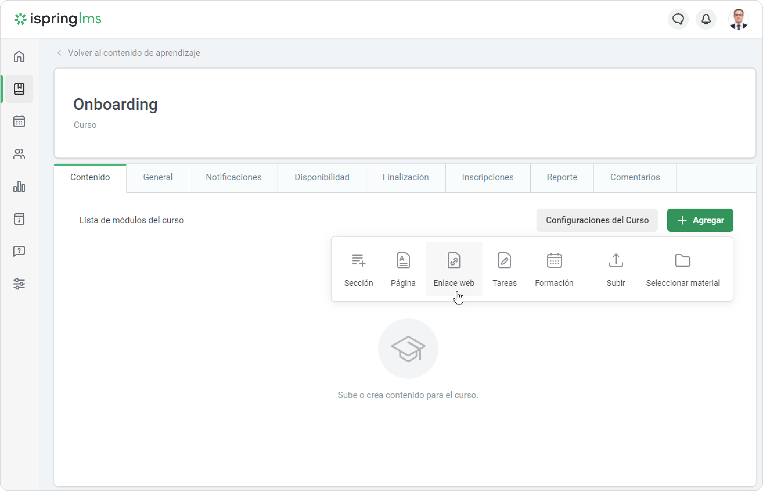 1. Abra su curso, seleccione la  pestaña Contenido, haga clic en Agregar y elija Enlace web.