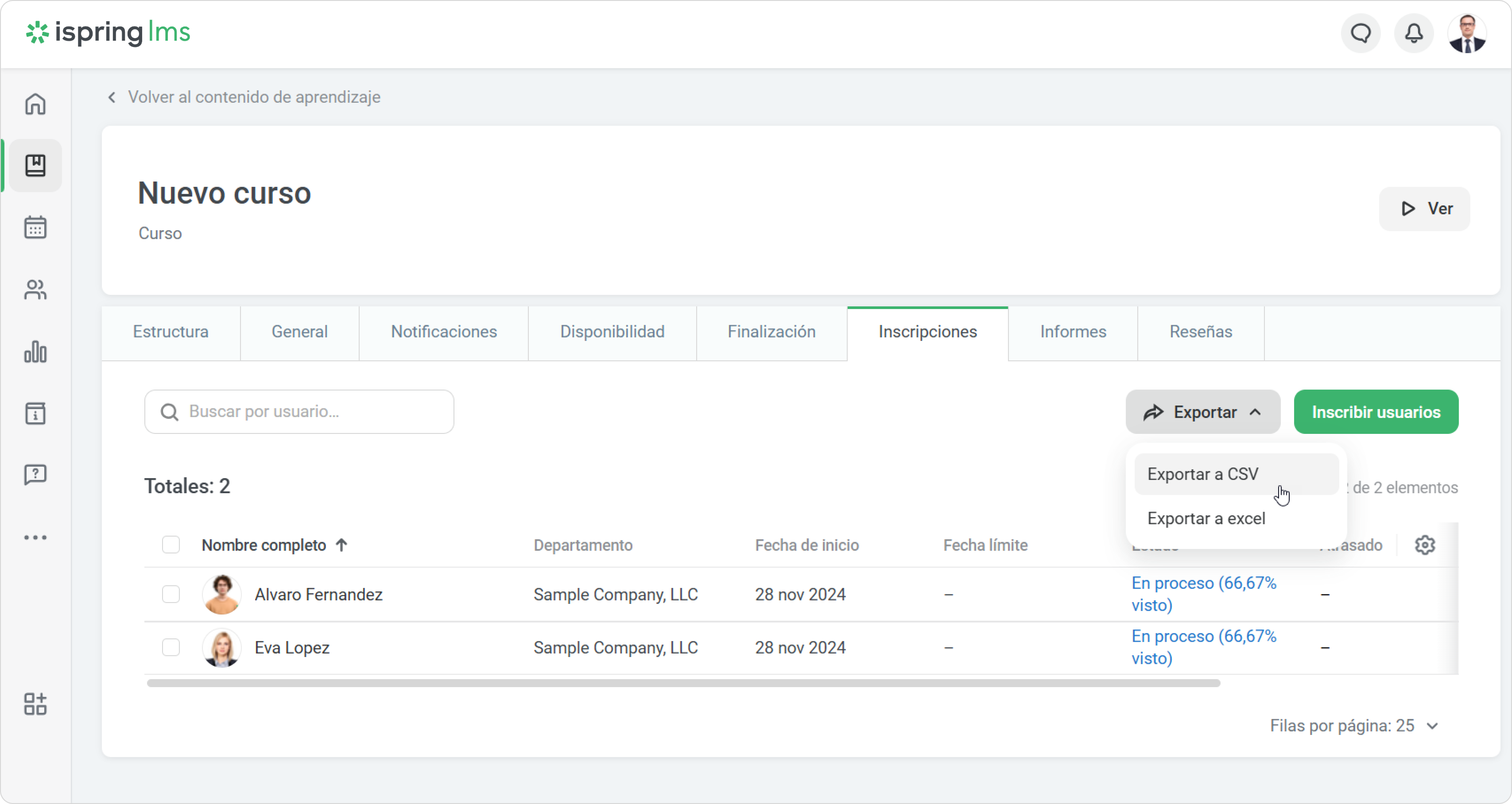 Puede que necesite obtener una lista completa de los alumnos que tienen que hacer un curso. En este caso, la opción de exportar las inscripciones de un curso a un archivo CSV será muy útil.