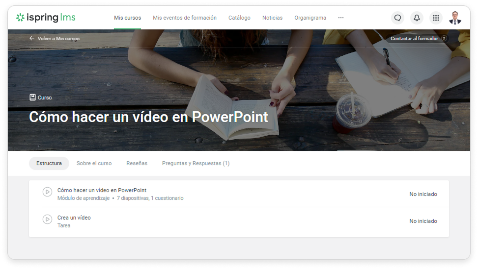 En la sección Mis cursos, los usuarios pueden ver una lista con el contenido que les ha sido asignado y empezar a hacer cursos y ver elementos de contenido. Para empezar un curso, haz clic en su miniatura.
