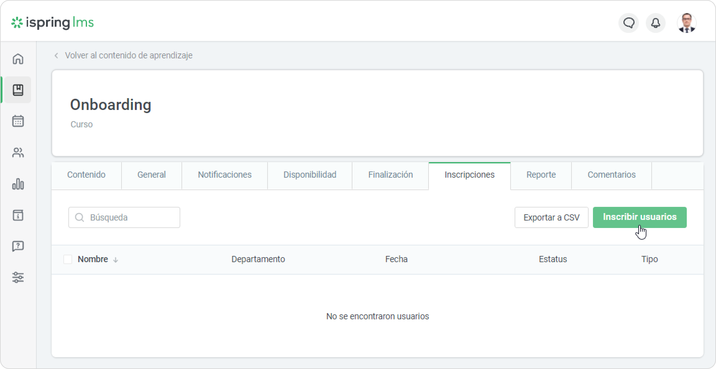 - Haga clic en el curso y abra la pestaña Inscripciones. Después, haga clic en el botón Inscribir usuarios.