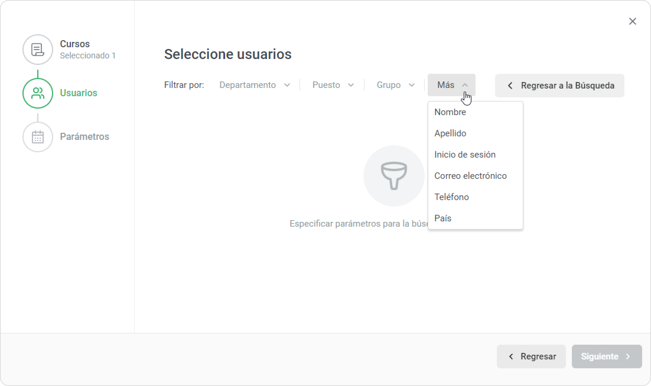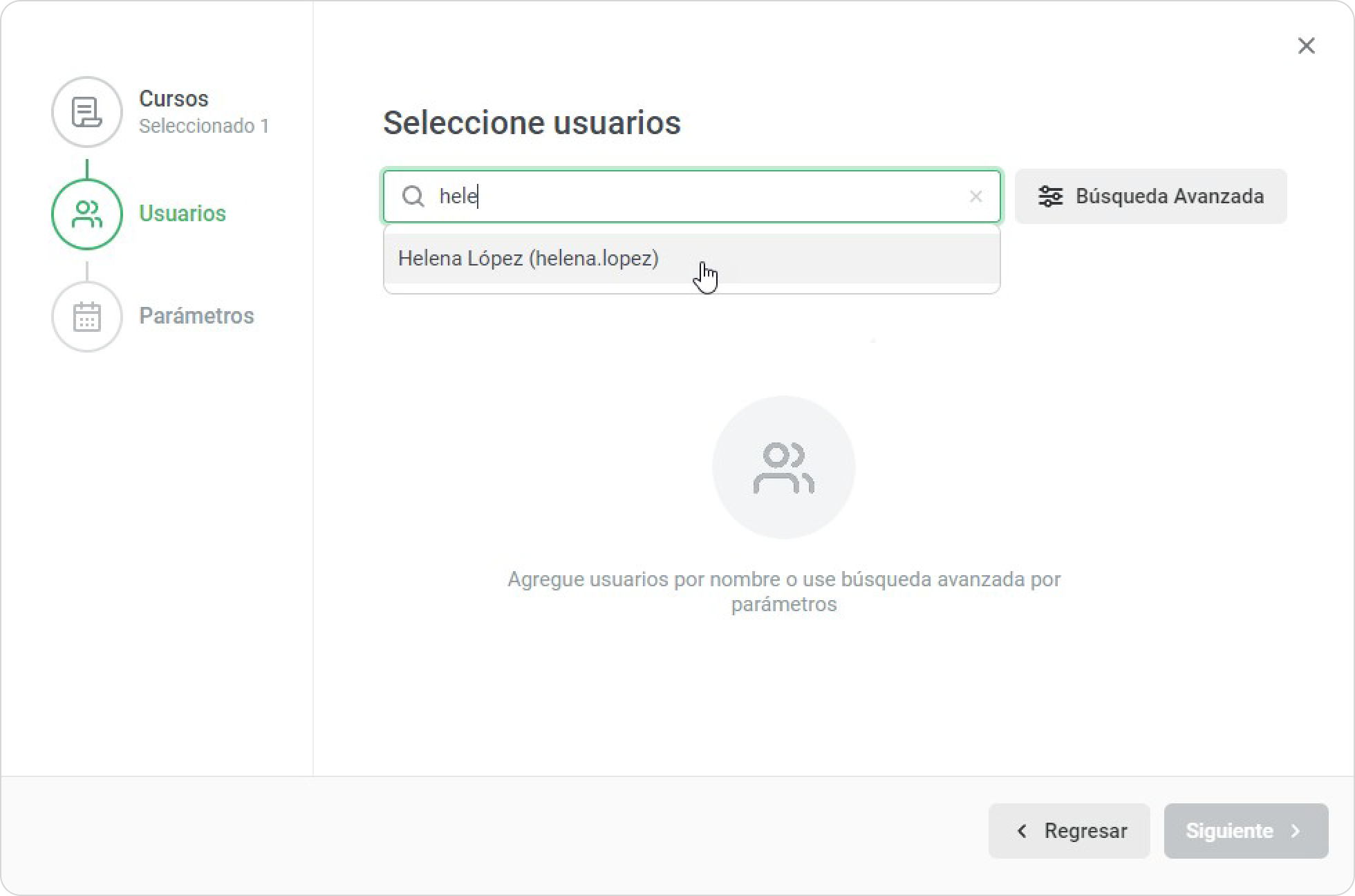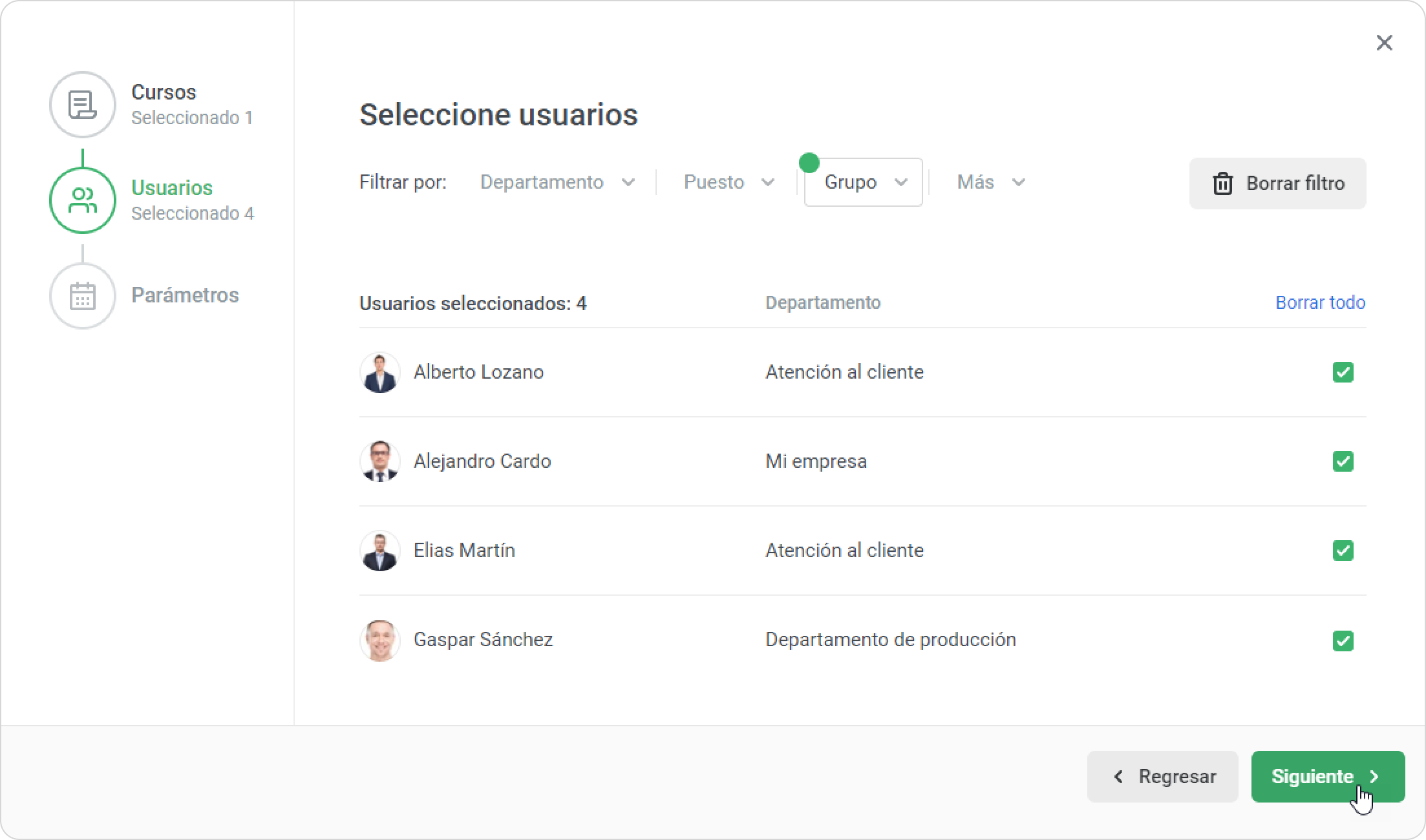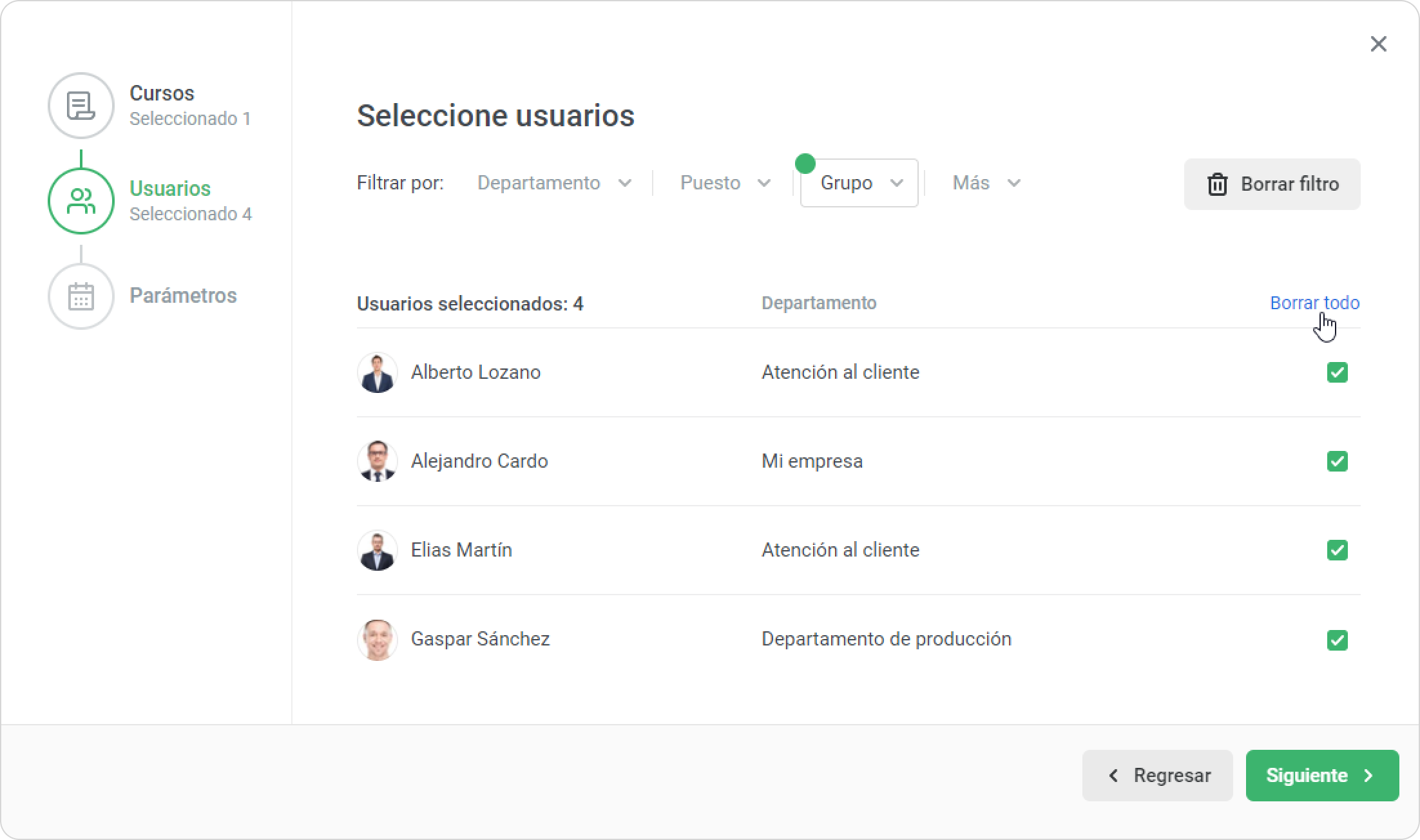 El filtrado por otros parámetros funciona de la misma manera. Filtre a los usuarios según un valor específico y asigne los cursos que deben hacer. - Para eliminar (anular la selección) un usuario de la lista, haga clic en la "x" junto a su nombre. Si desea vaciar la lista por completo, haga clic en Borrar todo.
