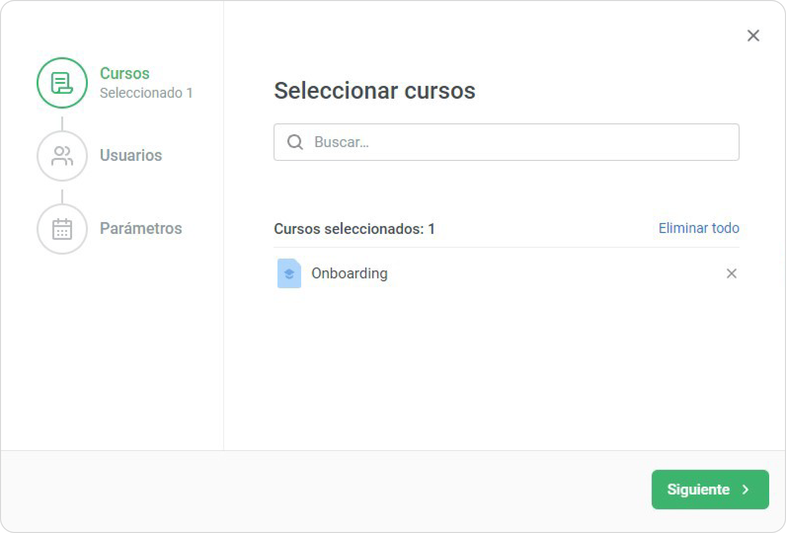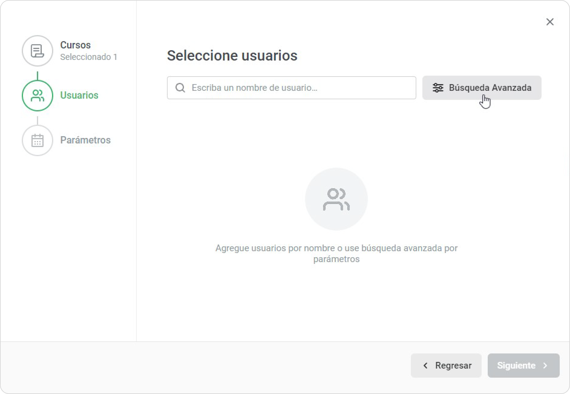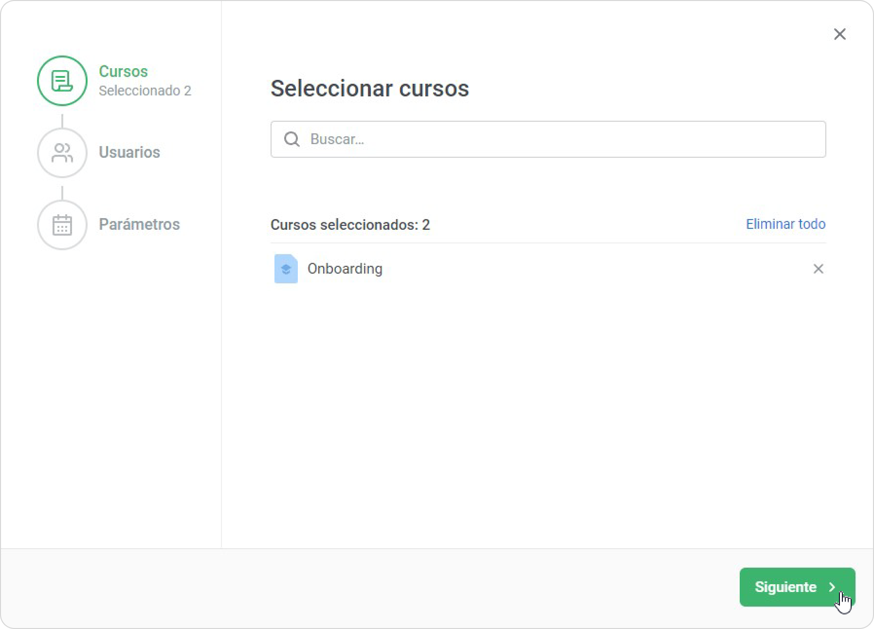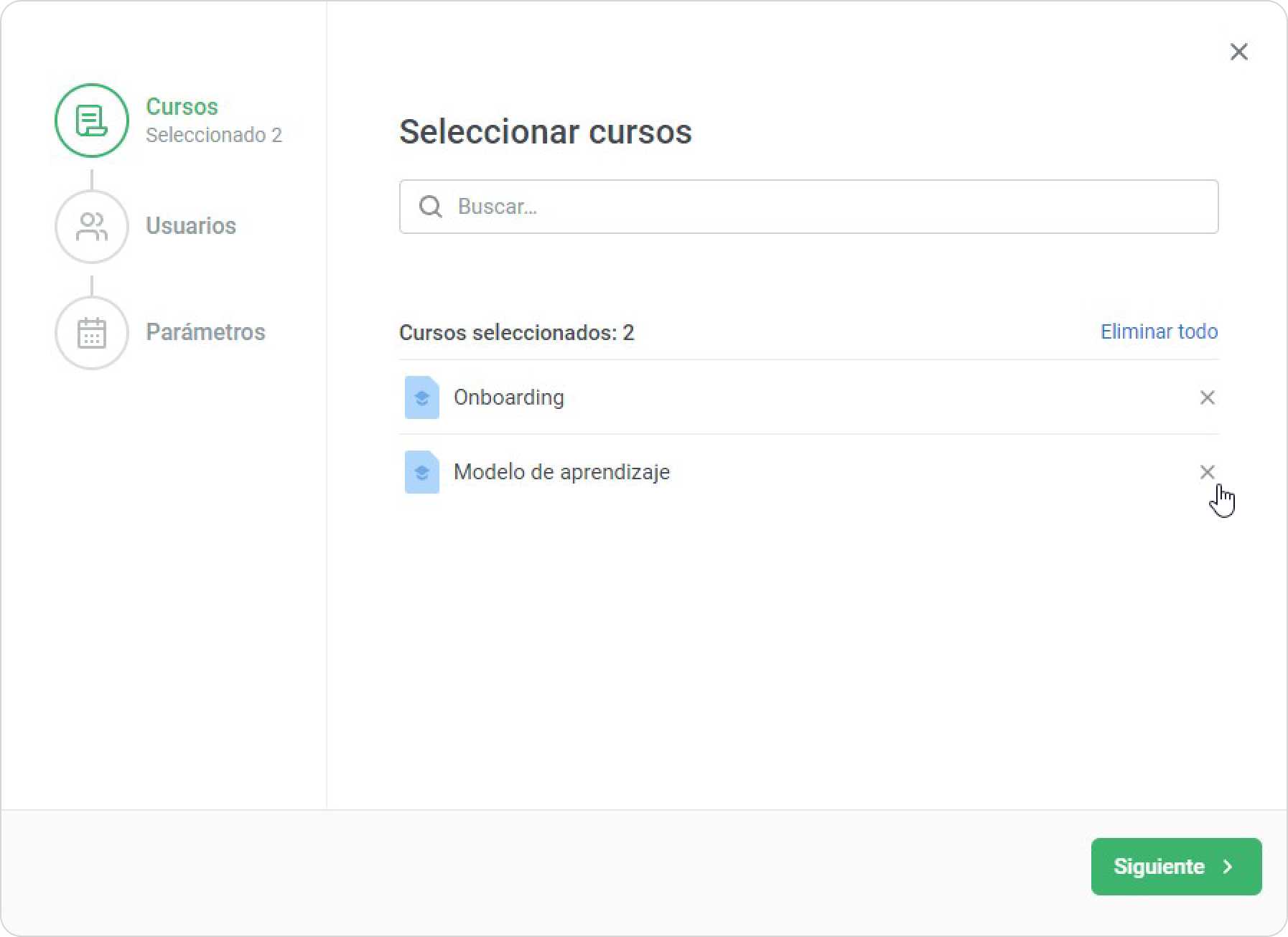 El filtrado por otros parámetros funciona de la misma manera. Filtre a los usuarios según un valor específico y asigne los cursos que deben hacer. - Para eliminar (anular la selección) un usuario de la lista, haga clic en la "x" junto a su nombre. Si desea vaciar la lista por completo, haga clic en Borrar todo.