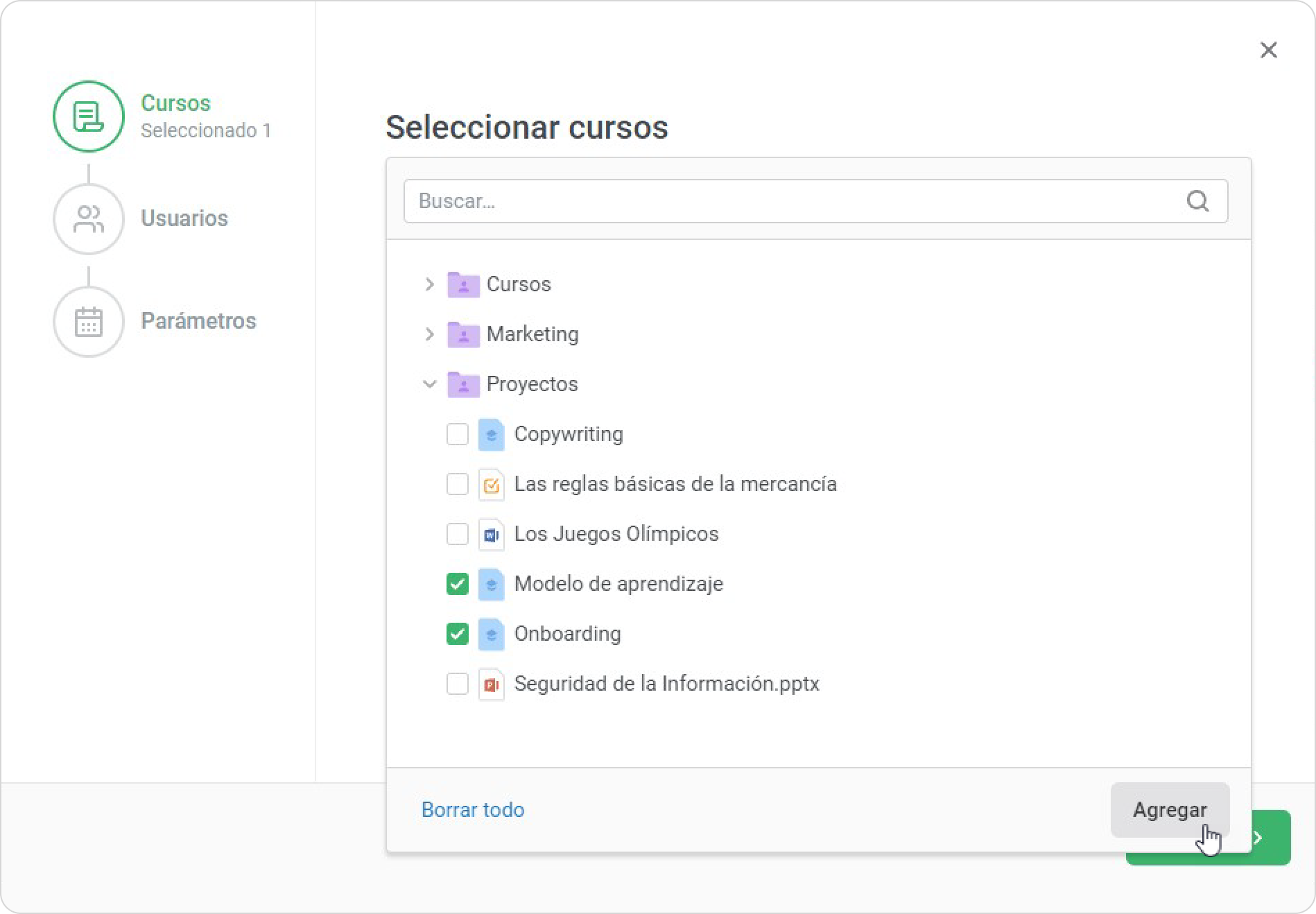 - Añadir cursos adicionales a la lista de elementos asignados. Para hacer esto, haga clic en la barra de búsqueda, elija los elementos de contenido necesarios y haga clic en el botón Agregar.
