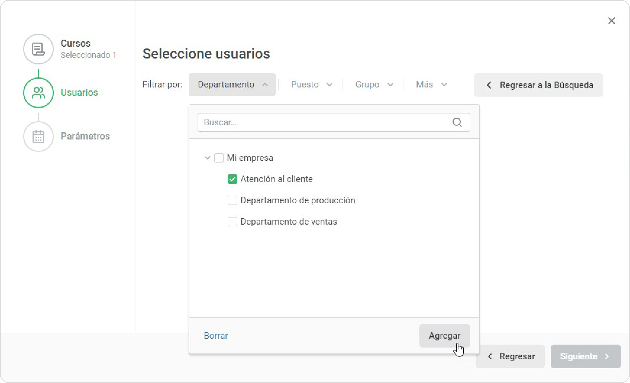 Puede asignar cursos a usuarios que pertenecen a un departamento específico o varios departamentos. Por ejemplo, asigne el curso Reglas de negociación eficaz a todo el departamento de ventas.