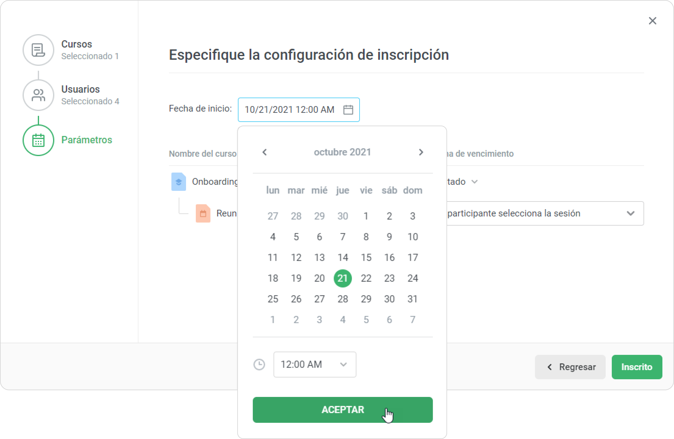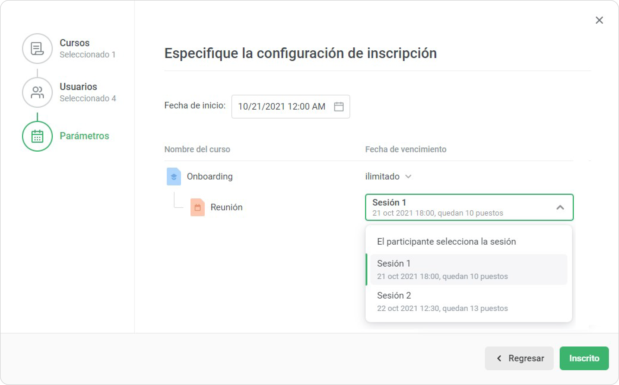 Por último, haga clic en Aceptar. - Si un curso incluye una formación, seleccione la sesión en la que los usuarios serán inscritos. Si elige El participante selecciona la sesión, los usuarios podrán seleccionar por sí mismos una sesión en el portal de usuario.